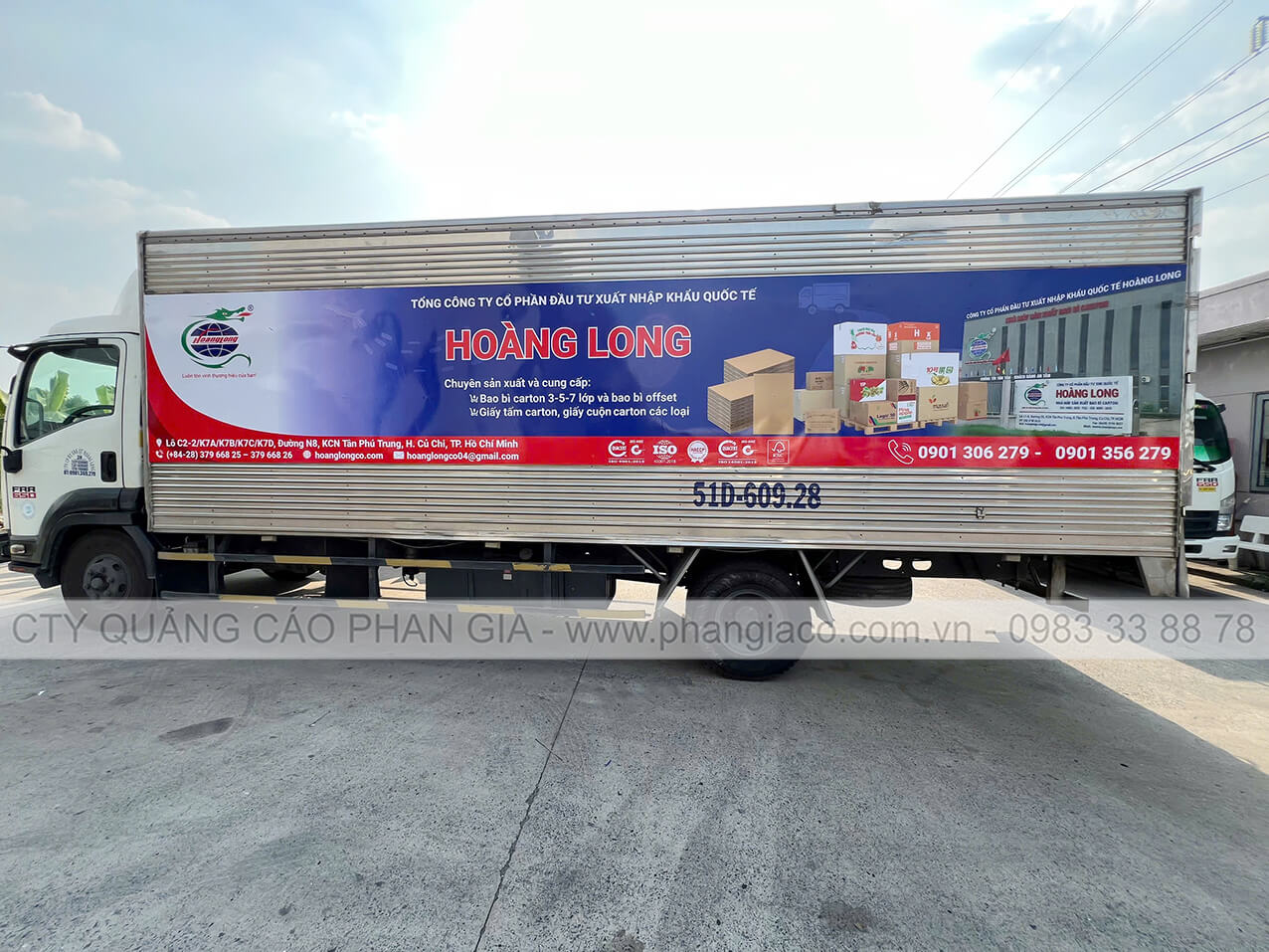 Quảng Cáo Phan Gia, nhà cung cấp quảng cáo ngoài trời uy tín - chuyên nghiệp tại TP. Hồ Chí Minh, chuyên nhận khảo sát, thiết kế và thi công dán quảng cáo thùng xe tải, dán quảng cáo xe tải với số lượng lớn cho các công ty, hãng, nhà máy ...có nhu cầu quảng cáo logo, thương hiệu, sản phẩm của mình đến với công chúng qua phương tiện vận tải. Hình ảnh thi công & dán decal quảng cáo 02 bên hông thùng xe tải của nhà máy bao bì Hoàng Long với hơn 15 chiếc tại KCN Tân Phú Trung, huyện Củ Chi được Phan Gia thi công thực hiện tháng 04/2025.