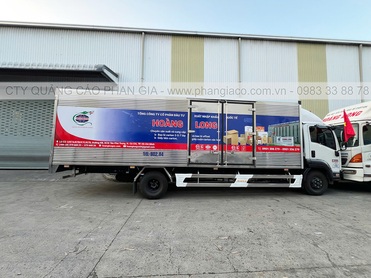 Quảng Cáo Phan Gia, nhà thầu thi công dán decal quảng cáo trên thùng xe tải uy tín - chuyên nghiệp tại TP. Hồ Chí Minh, chúng tôi chuyên nhận khảo sát, thiết kế, thi công hoàn thiện decal quảng cáo xe tải với số lượng lớn cho các công ty, hãng, hợp tác xã vận tải có nhu cầu quảng bá hình ảnh logo, sản phẩm của mình trên phương tiện vận chuyển. Hình ảnh thi công hoàn thiện dán decal quảng cáo xe tải Phan Gia đã hoàn thiện cho công ty bao bì xuất nhập khẩu lớn tại Củ Chi với hơn 50 xe trọng tải các loại với nhiều quy cách loại thùng xe.