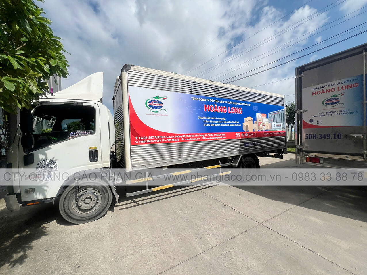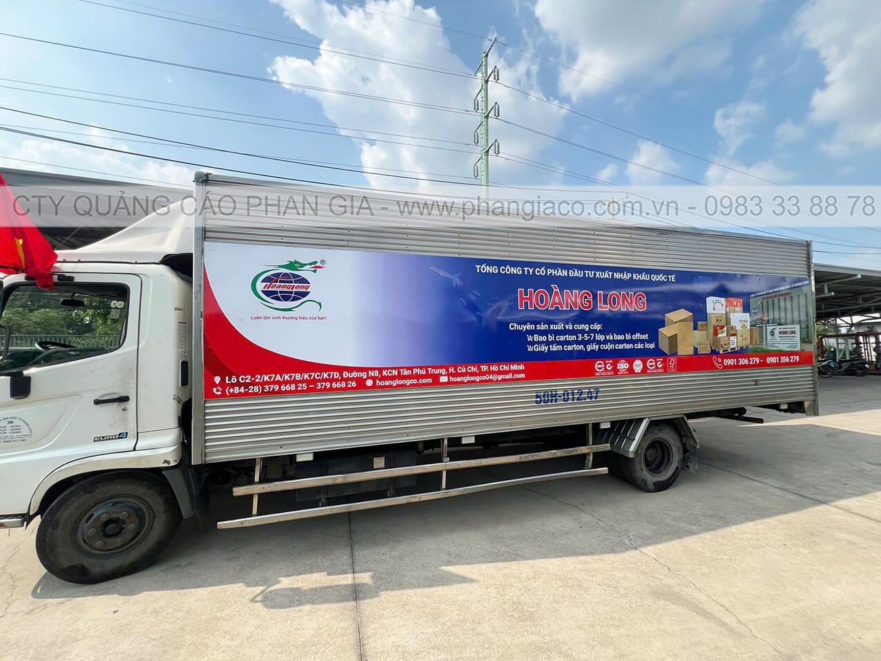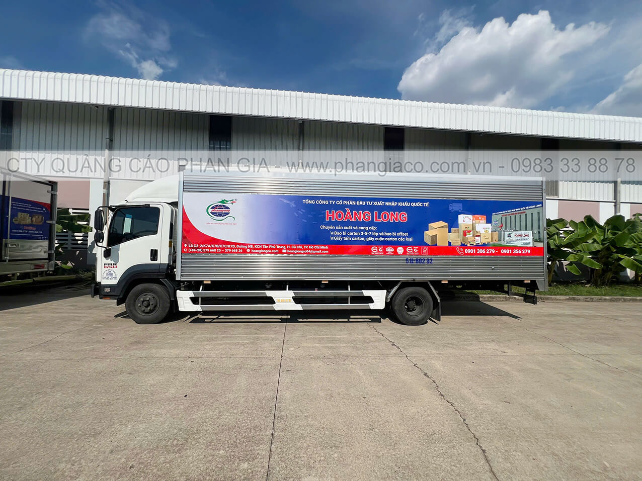 Chiều dài nội dung quảng cáo dài theo thùng xe, chiều cao nội dung quảng cáo bằng 1/2 chiều cao thùng xe
