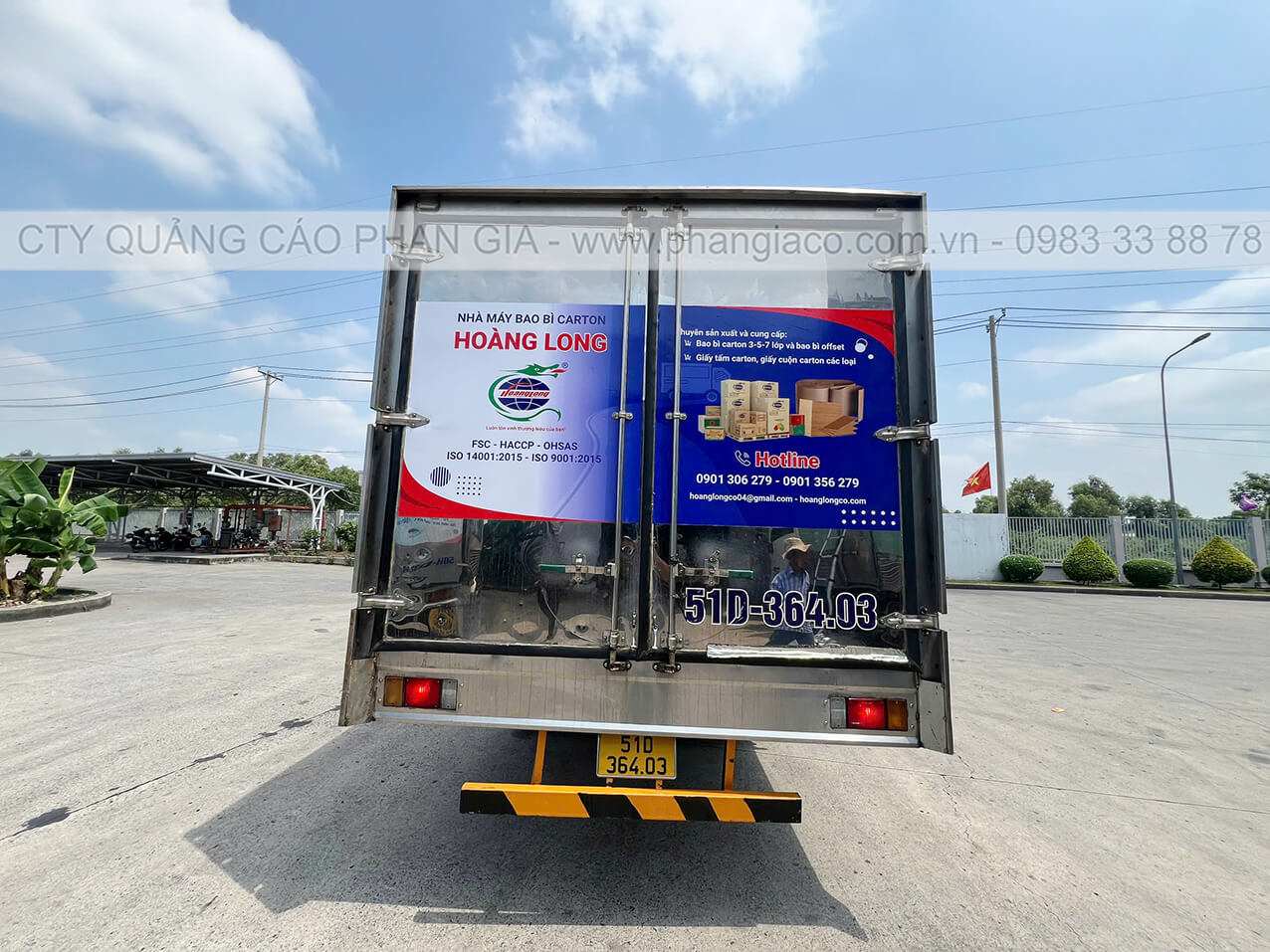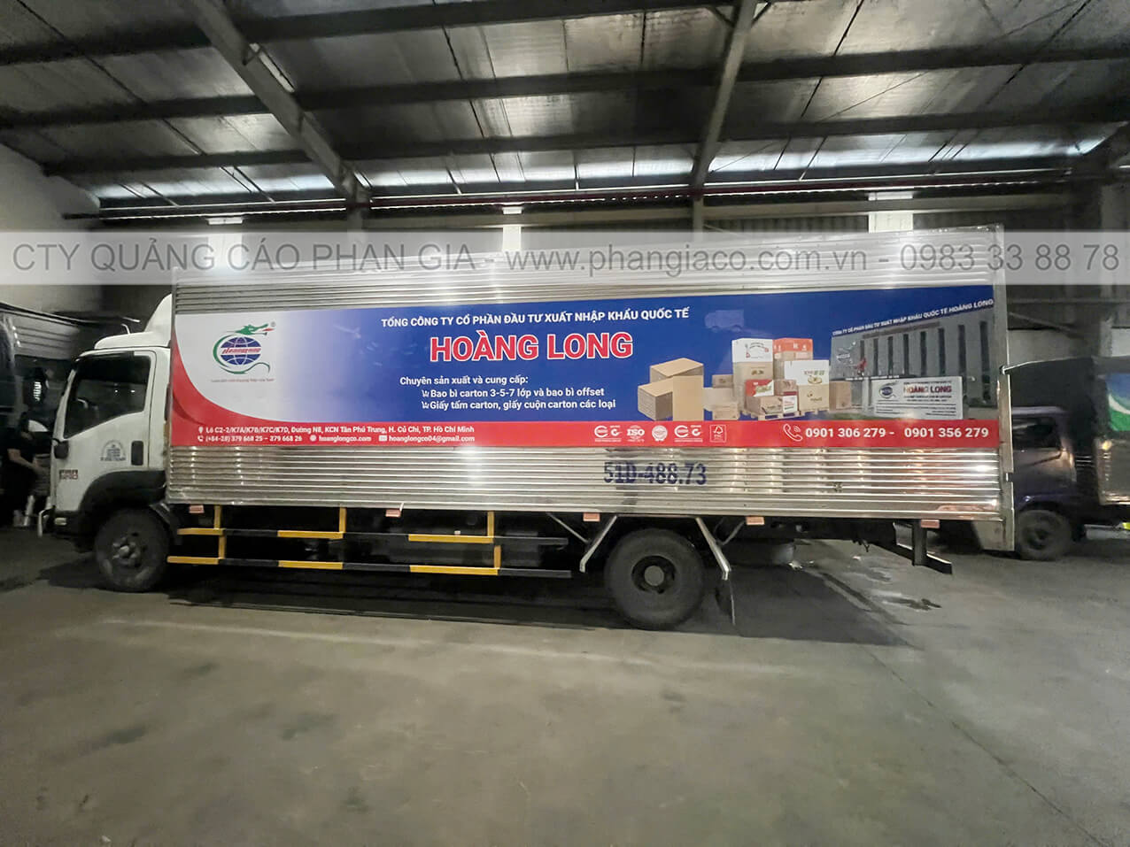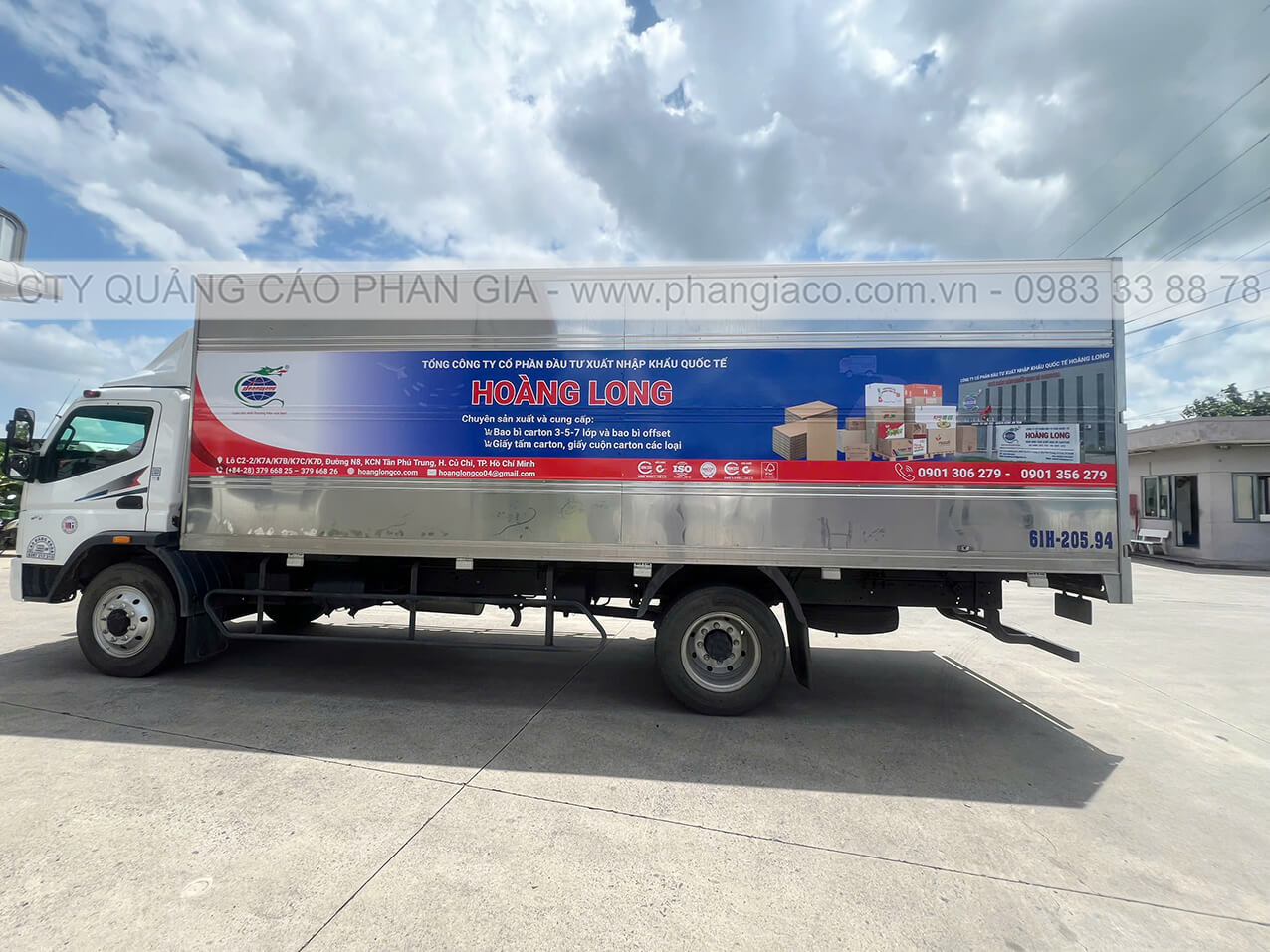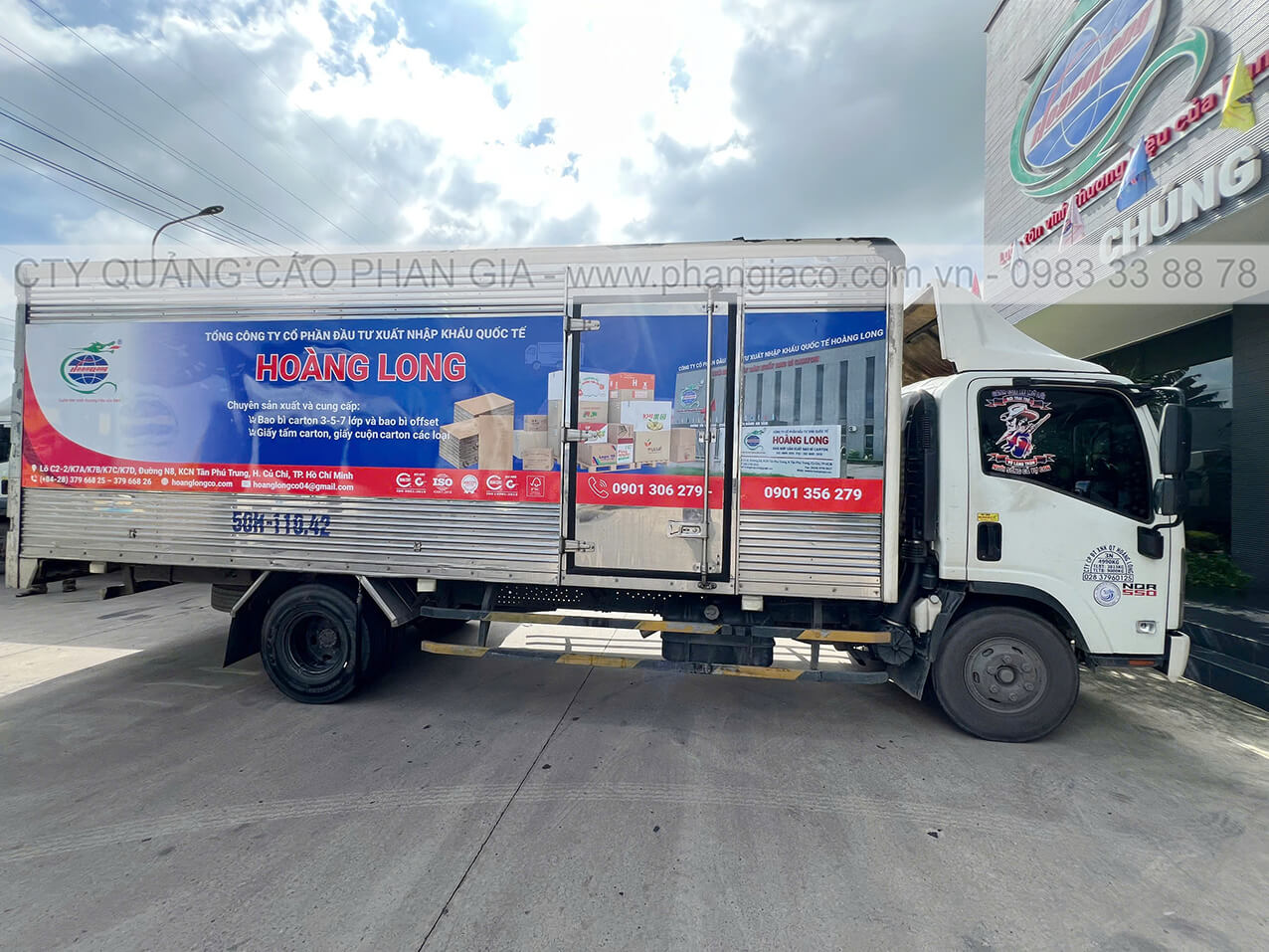 Chiều dài nội dung quảng cáo dài theo thùng xe, chiều cao nội dung quảng cáo bằng 1/2 chiều cao thùng xe