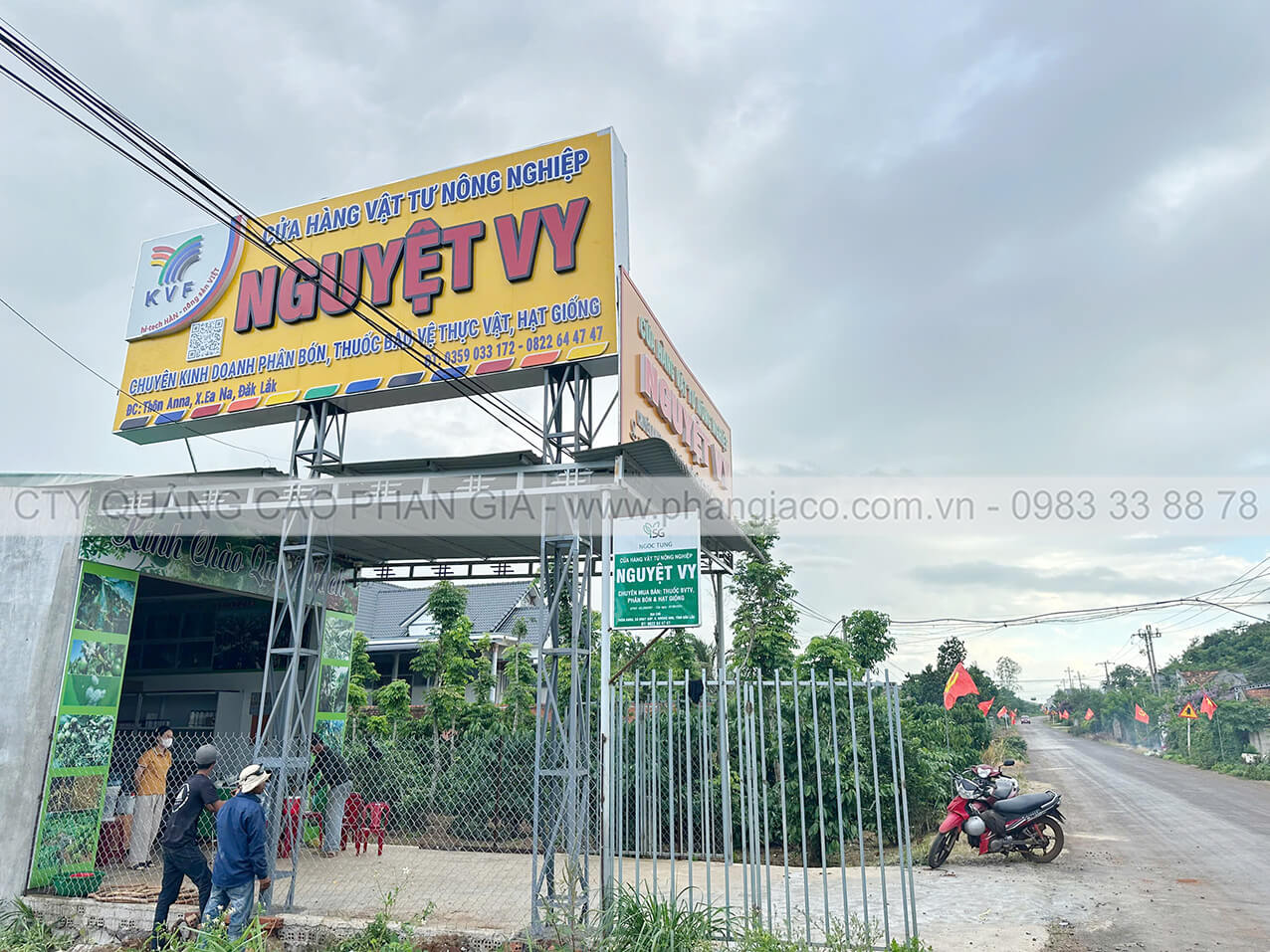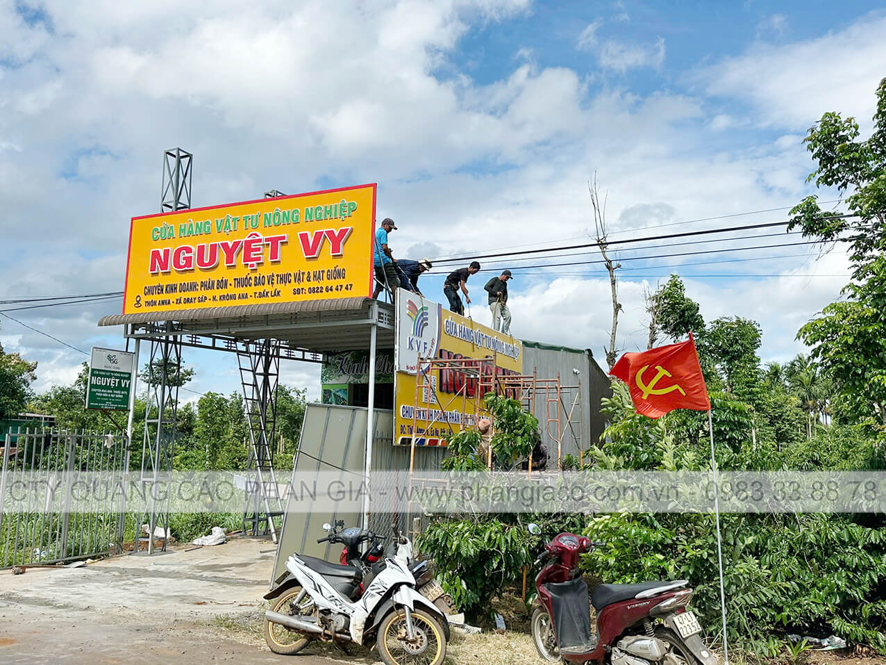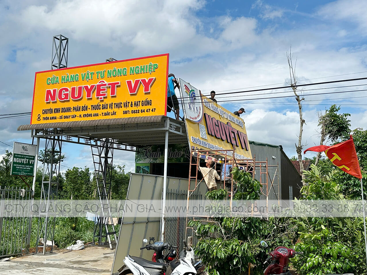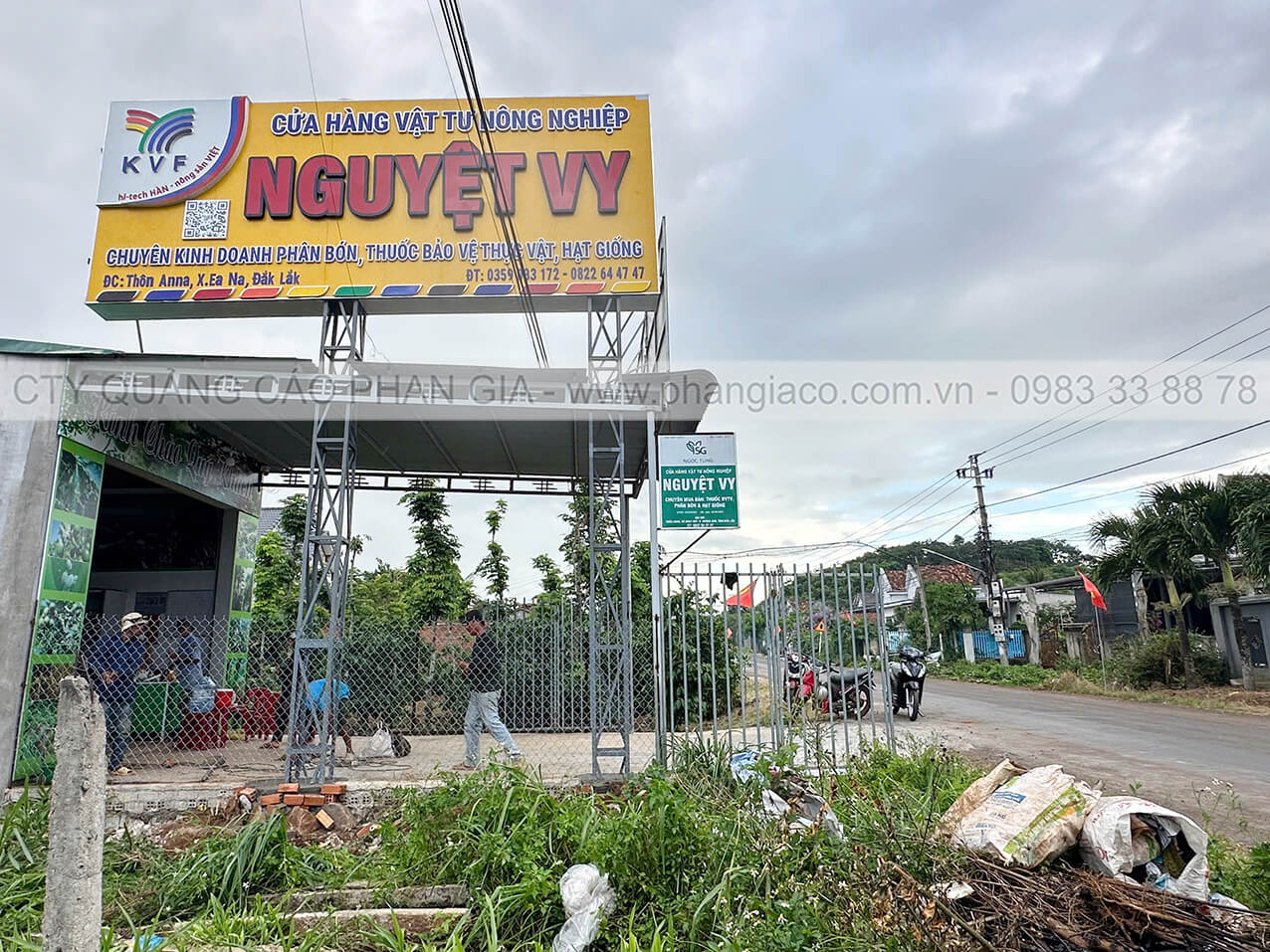 Pano quảng cáo cửa hàng vật tư nông nghiệp Nguyệt Vy được anh em thợ thi công Phan Gia hoàn thiện, nghiệm thu và bàn giao cho cửa hàng đưa vào sử dụng tại tỉnh Đắk Lắk
