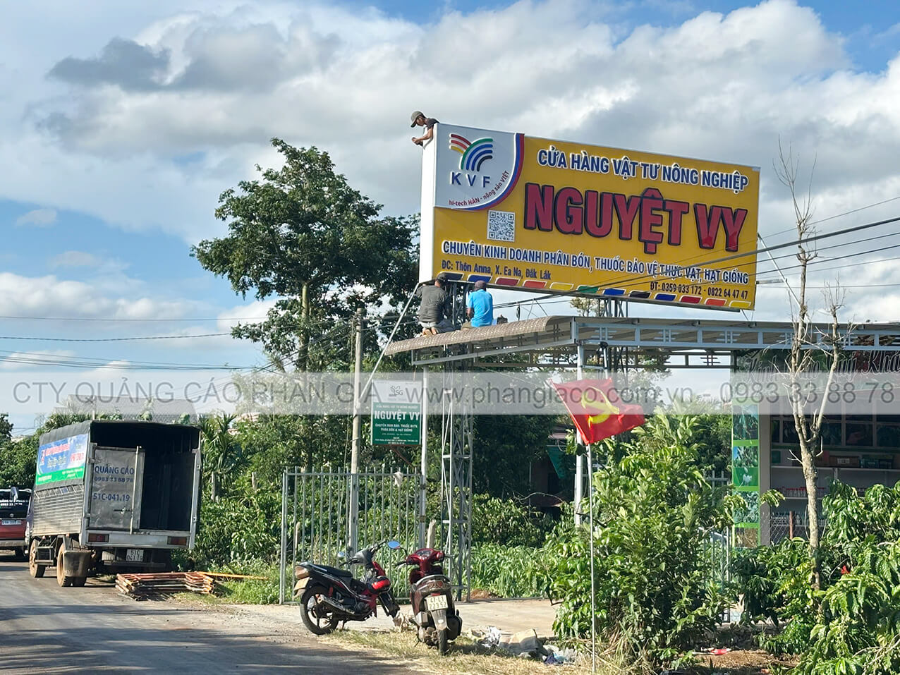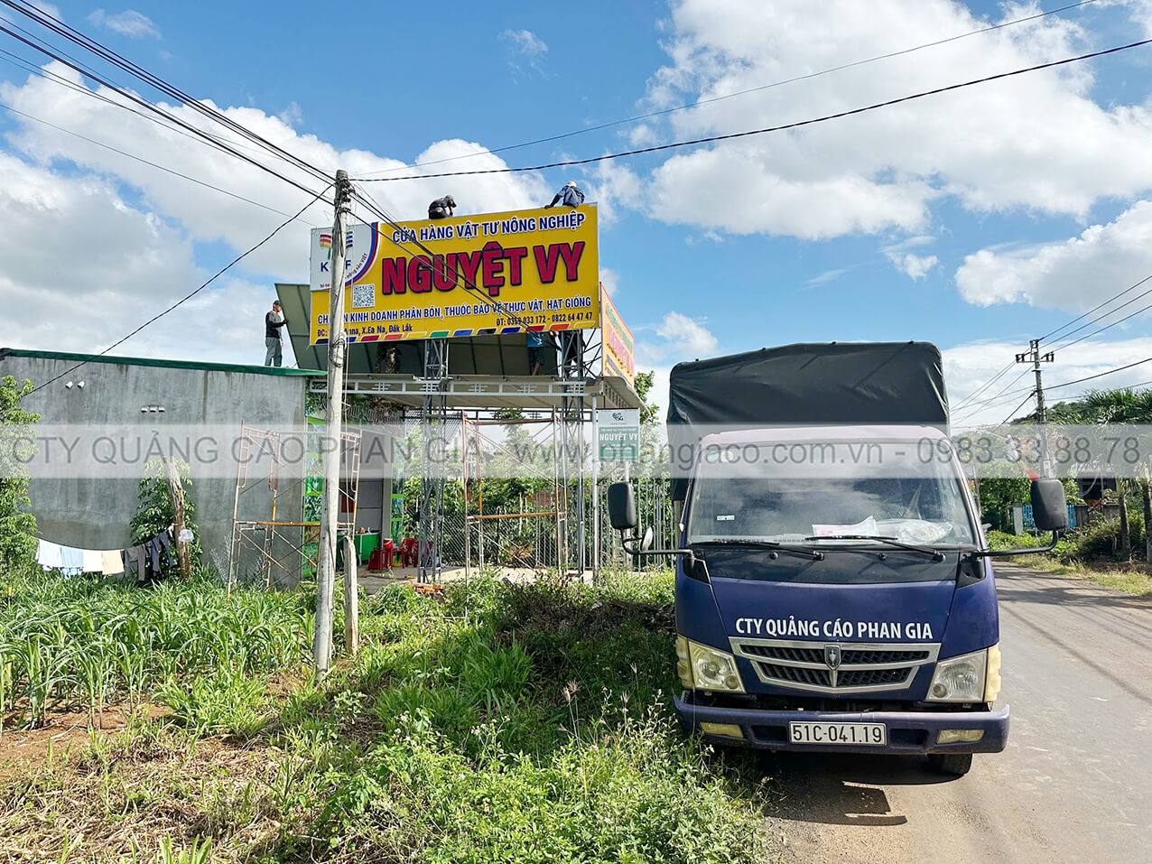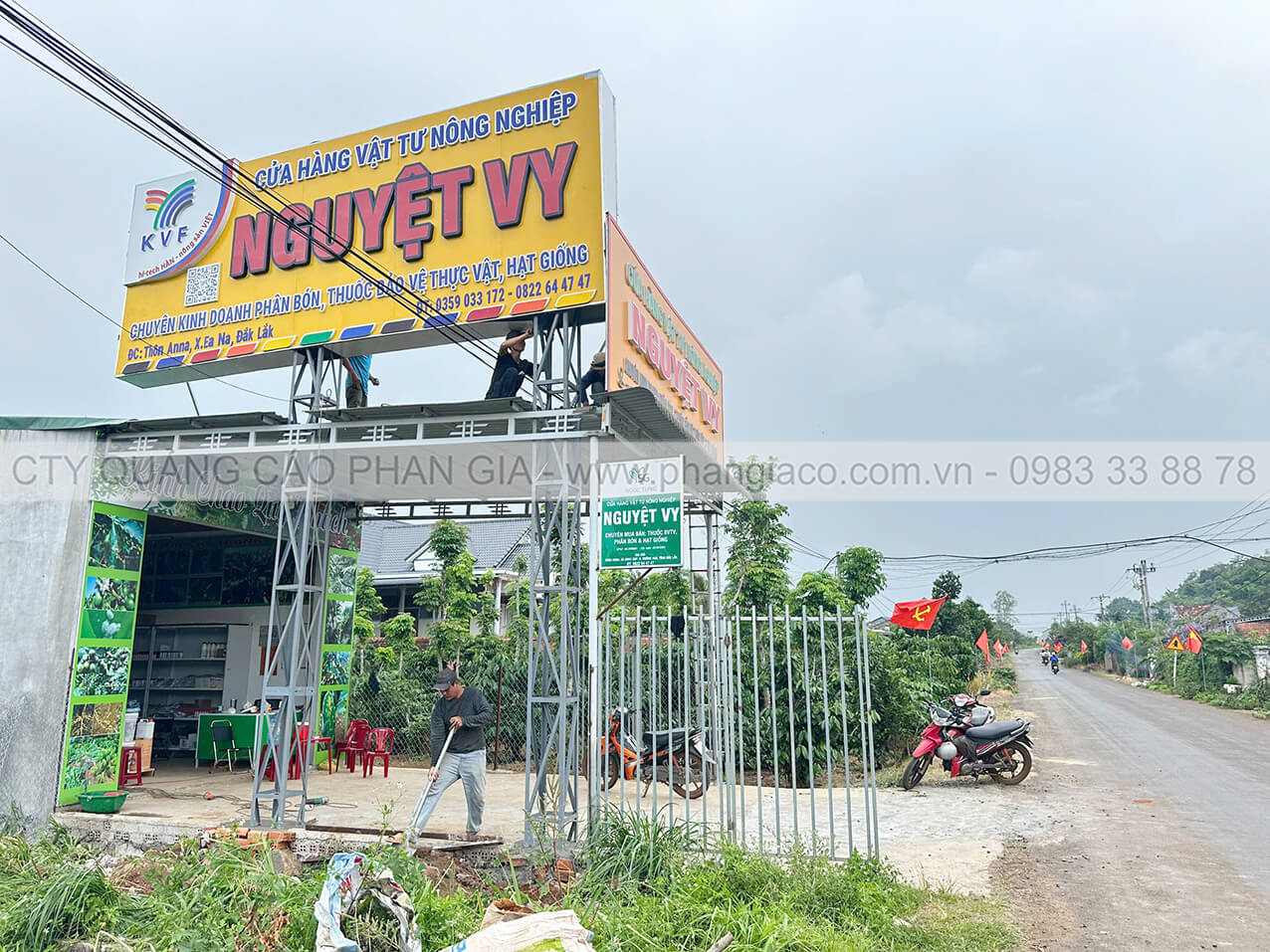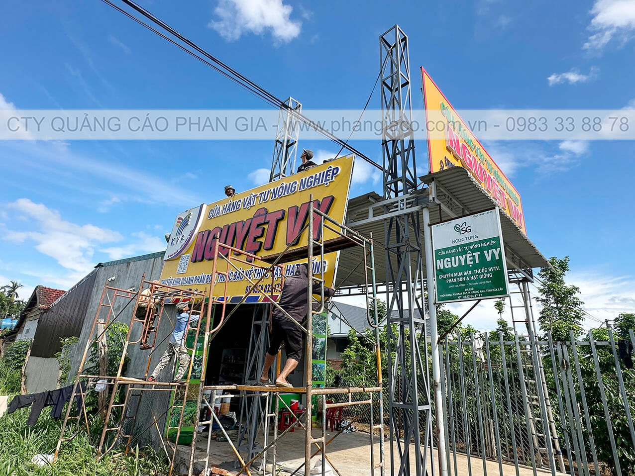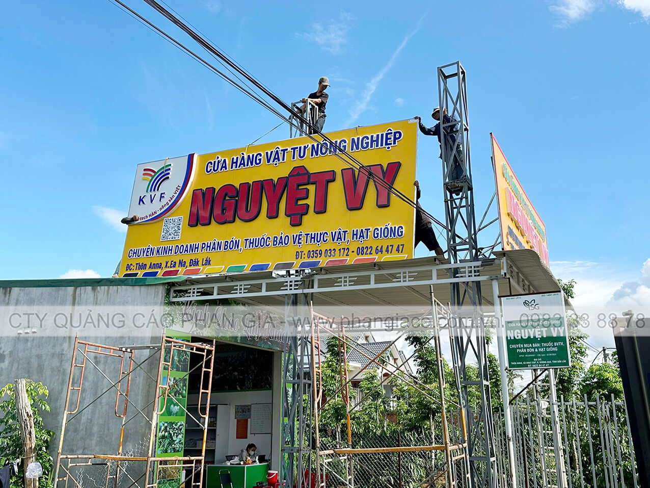 Pano quảng cáo cửa hàng vật tư nông nghiệp Nguyệt Vy được anh em thợ thi công Phan Gia hoàn thiện, nghiệm thu và bàn giao cho cửa hàng đưa vào sử dụng tại tỉnh Đắk Lắk