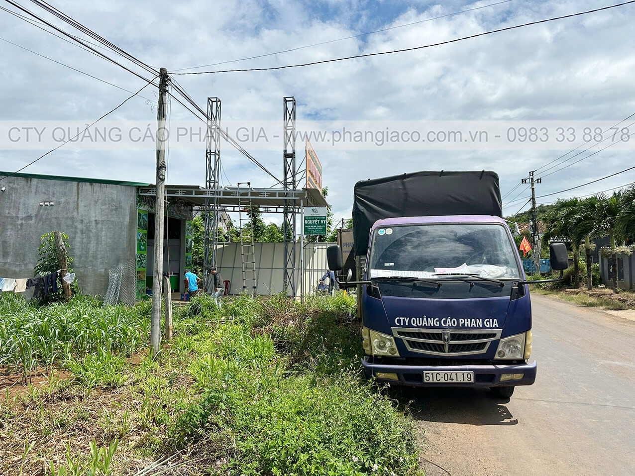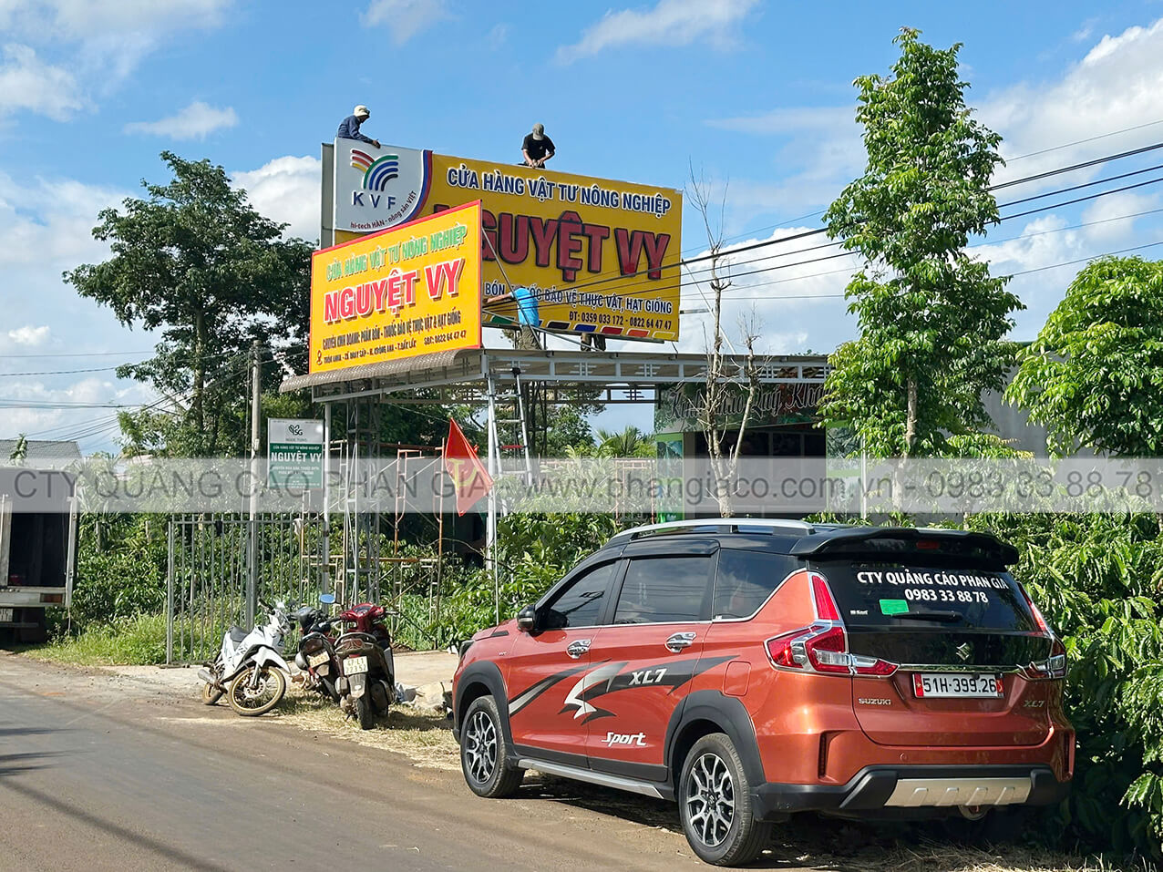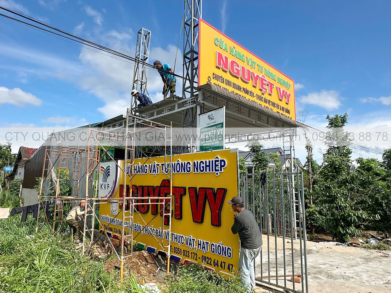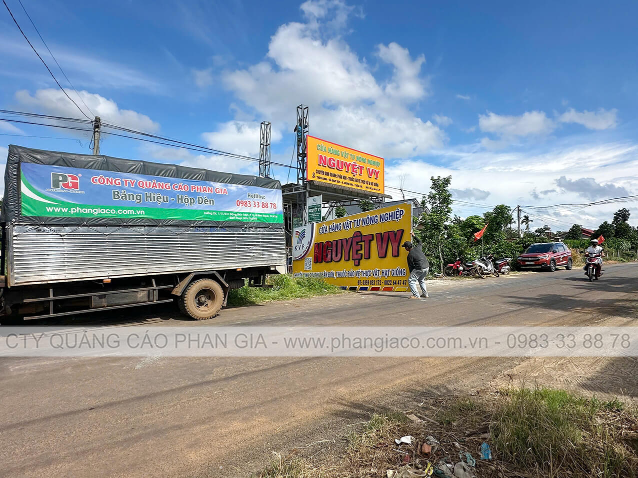 Pano quảng cáo cửa hàng vật tư nông nghiệp Nguyệt Vy được anh em thợ thi công Phan Gia hoàn thiện, nghiệm thu và bàn giao cho cửa hàng đưa vào sử dụng tại tỉnh Đắk Lắk