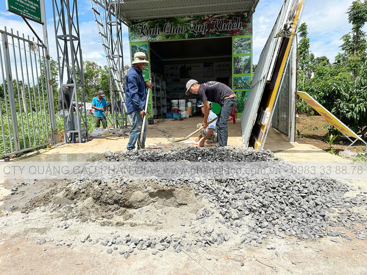 Hình ảnh anh em thợ Phan Gia đang hoàn thiện lắp đặt & gia cố pano quảng cáo cửa hàng vật tư nông nghiệp