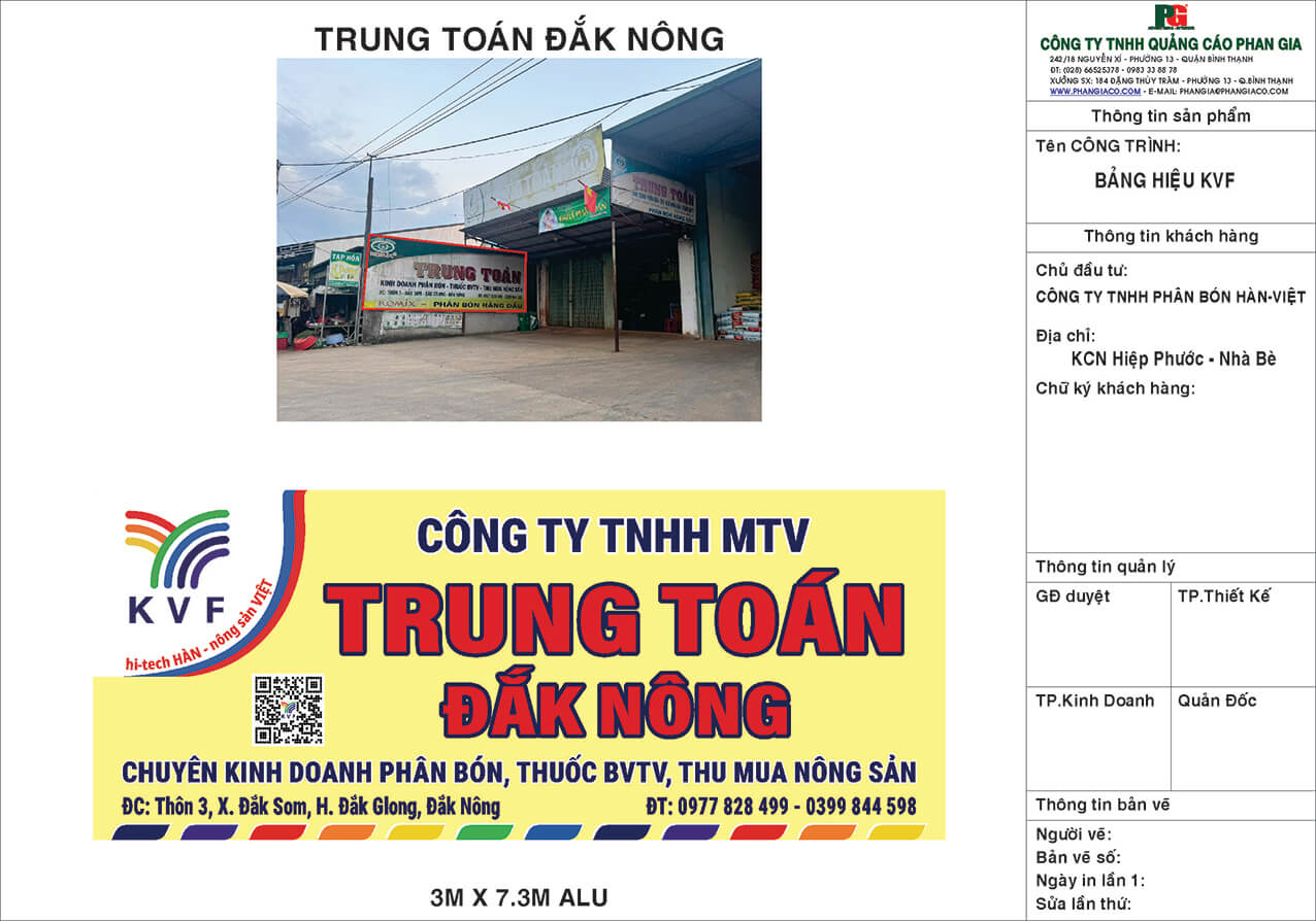Thiết kế và vị trí lắp đặt bảng hiệu nhôm chữ nổi mica nhà phân phối phân bón Trung Toán với kích thước 3m cao ngang 7.3m ngang