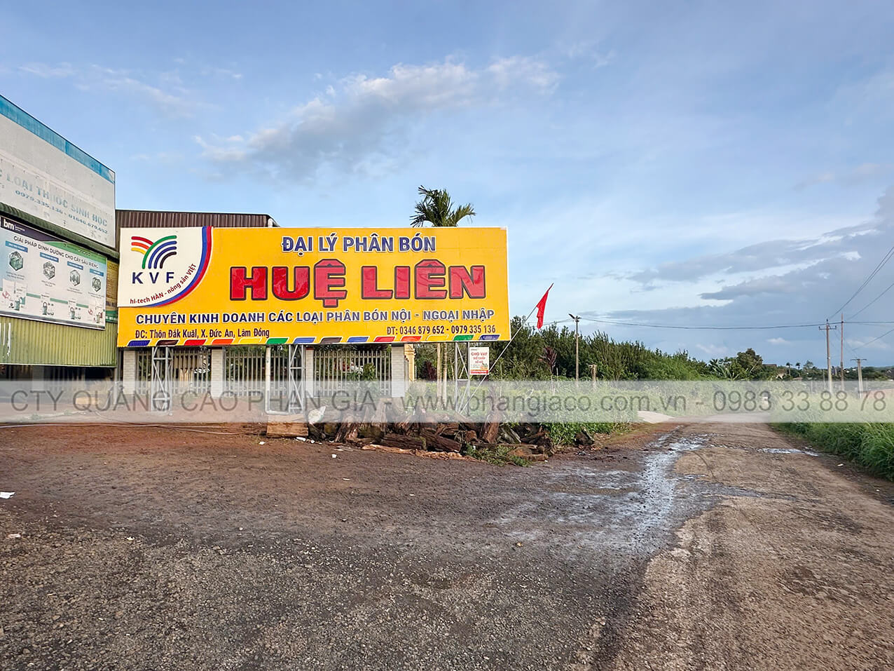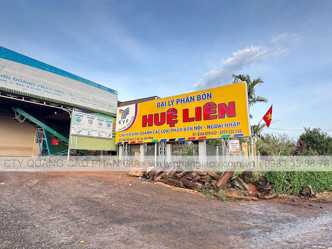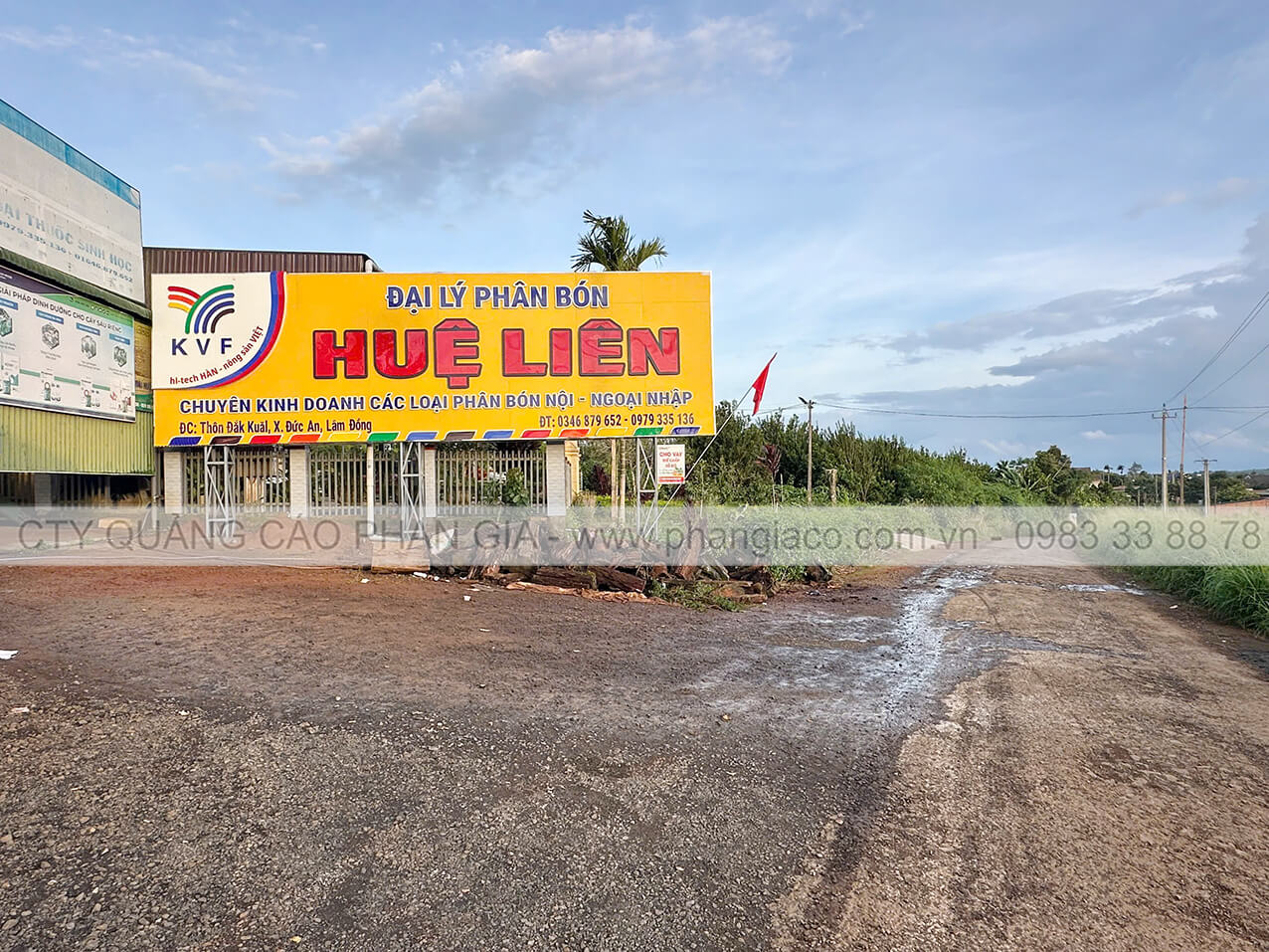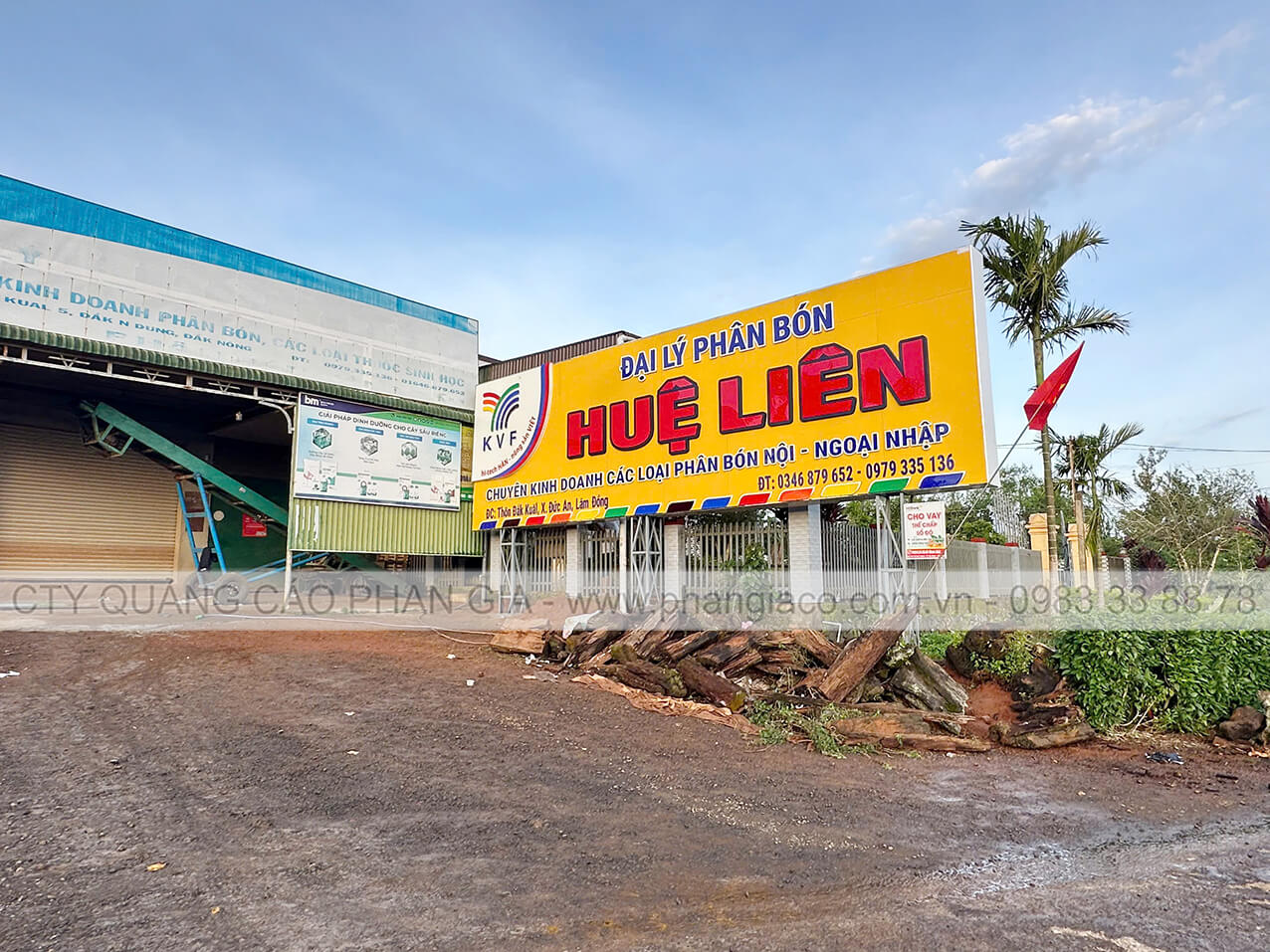 Pano quảng cáo alu chữ mica nổi dựng trụ V40 đại lý phân bón Huệ Liên được Quảng Cáo Phan Gia sản xuất & lắp đặt tại xã Đức An, Lâm Đồng (huyện Đắk Song, Đắk Nông cũ). Một số hình ảnh bảng quảng cáo alu đại lý được thợ thi công PG thực hiện và quy trình lắp đặt pano alu phân bón năm 2026.
