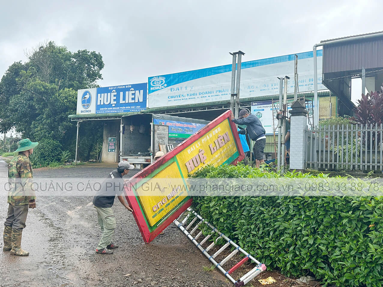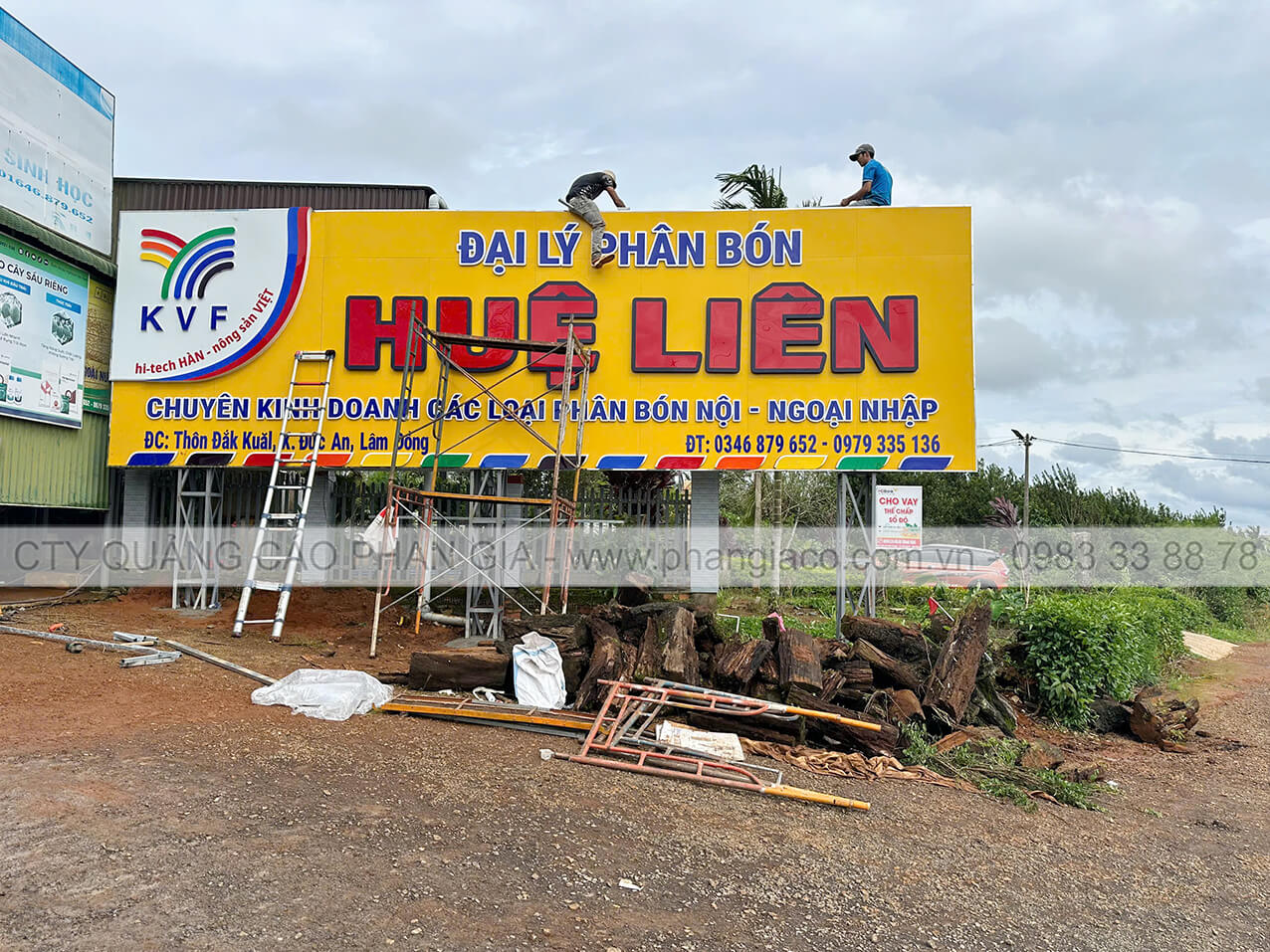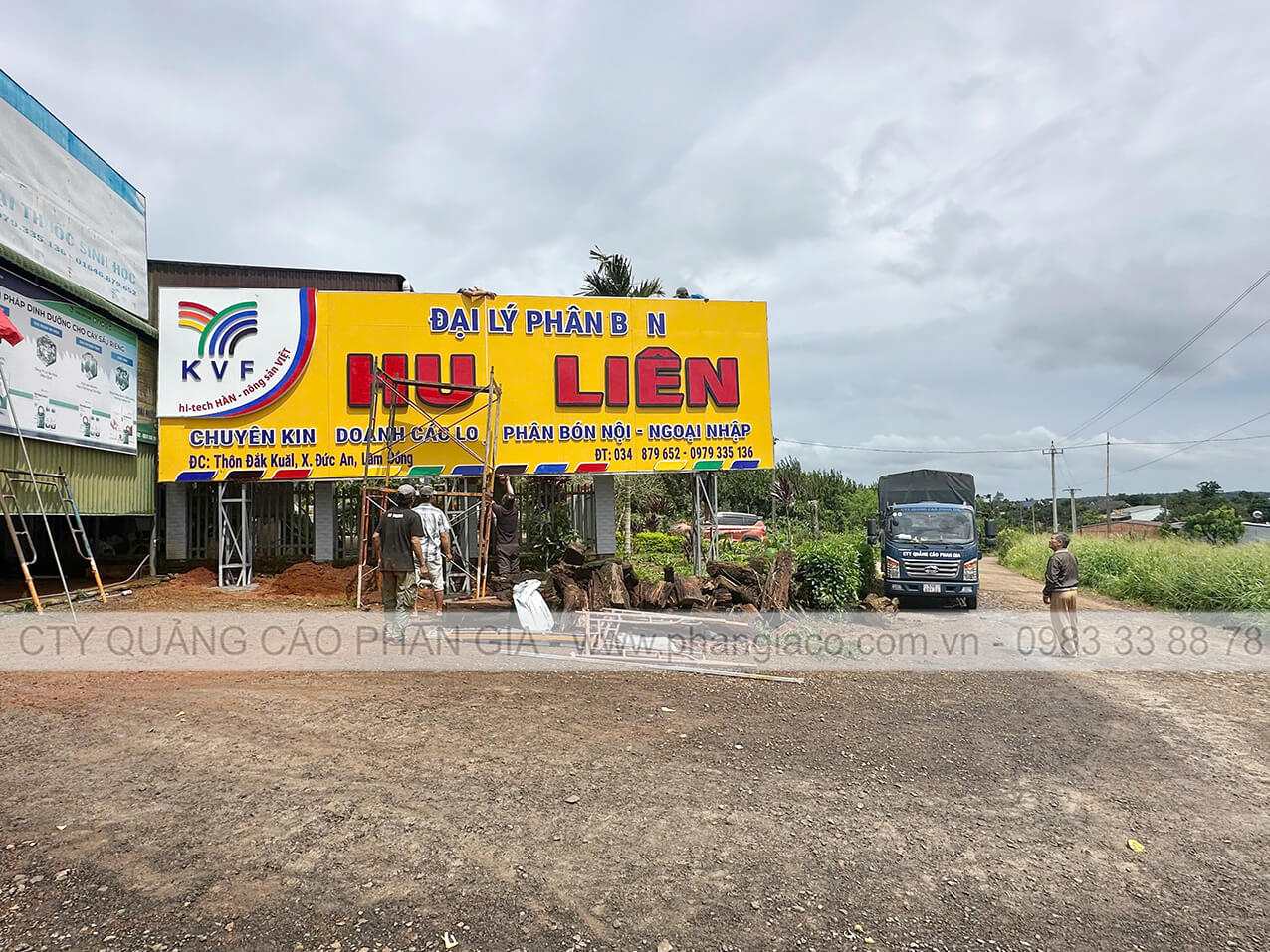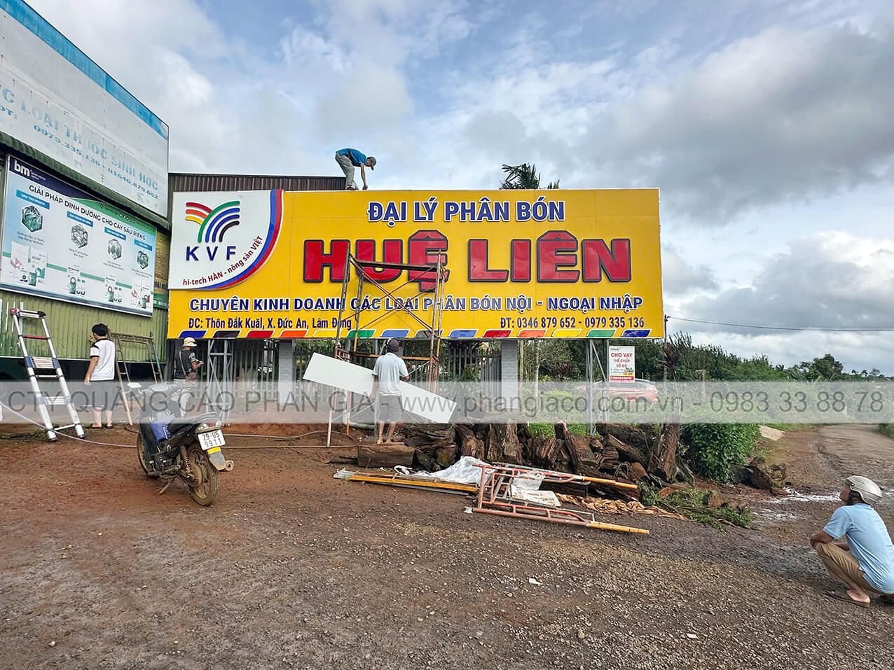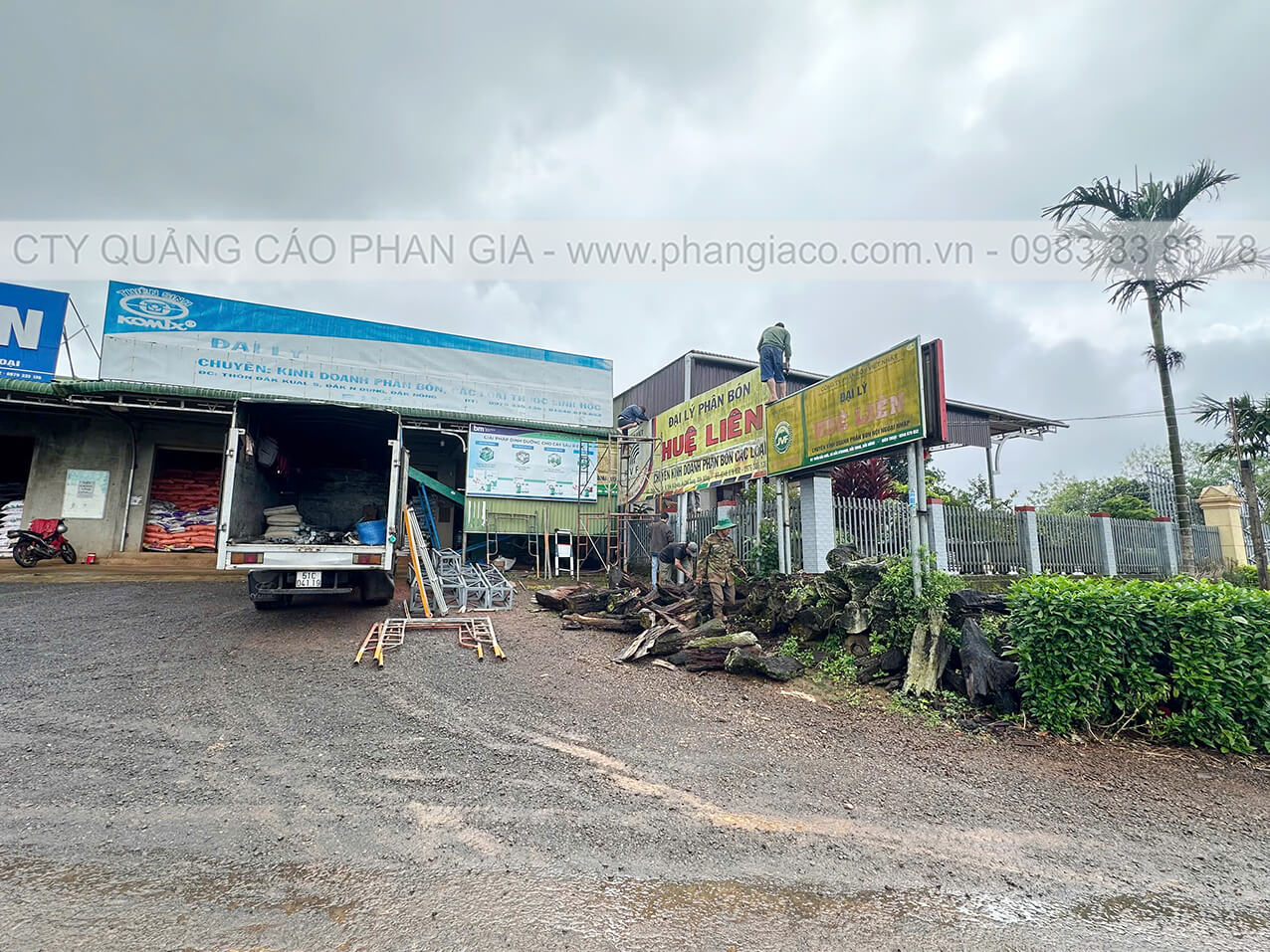 Pano quảng cáo alu chữ mica nổi dựng trụ V40 đại lý phân bón Huệ Liên được Quảng Cáo Phan Gia sản xuất & lắp đặt tại xã Đức An, Lâm Đồng (huyện Đắk Song, Đắk Nông cũ). Một số hình ảnh bảng quảng cáo alu đại lý được thợ thi công PG thực hiện và quy trình lắp đặt pano alu phân bón năm 2026.