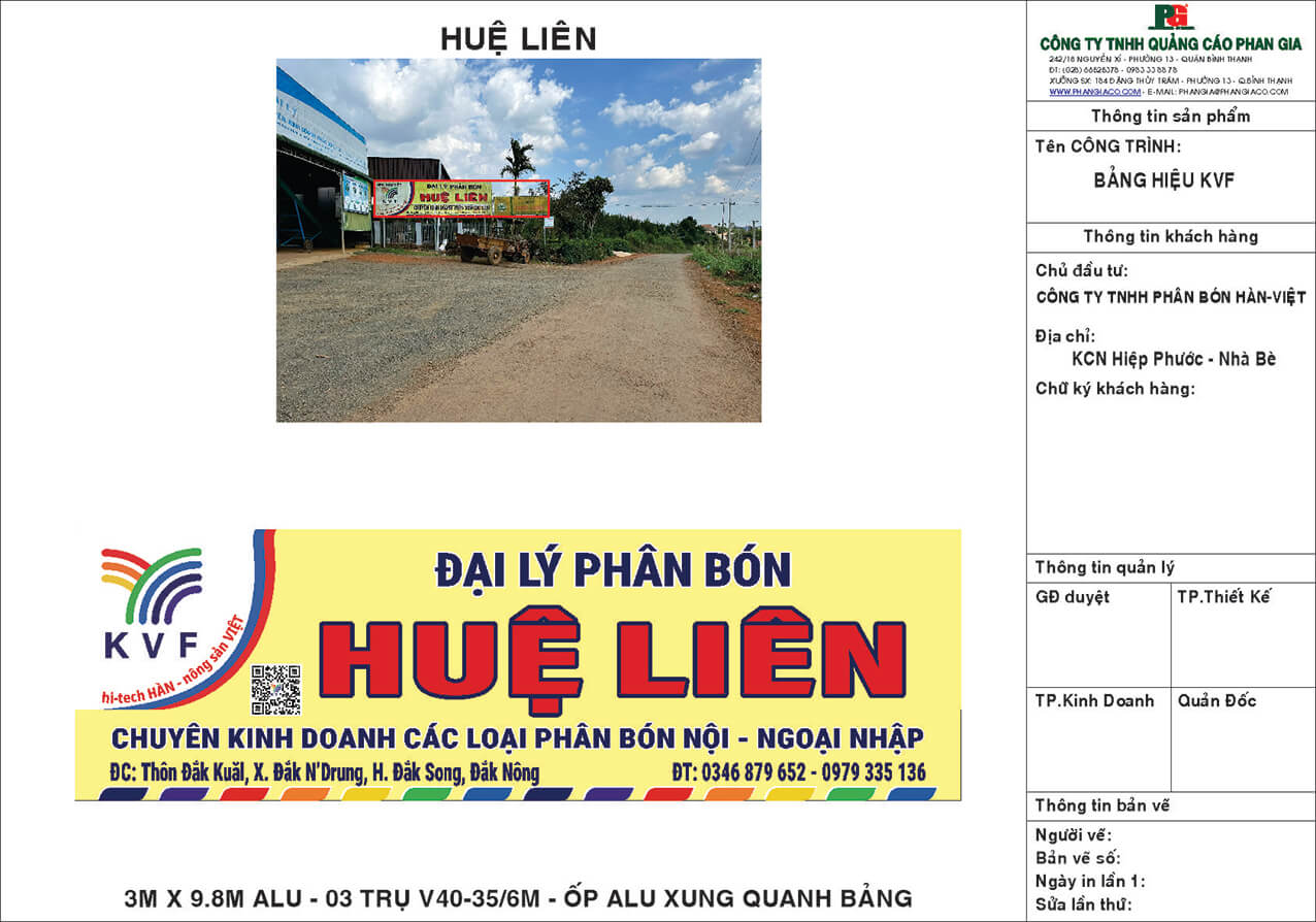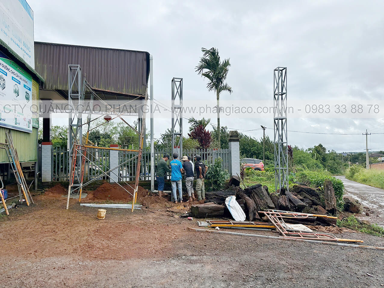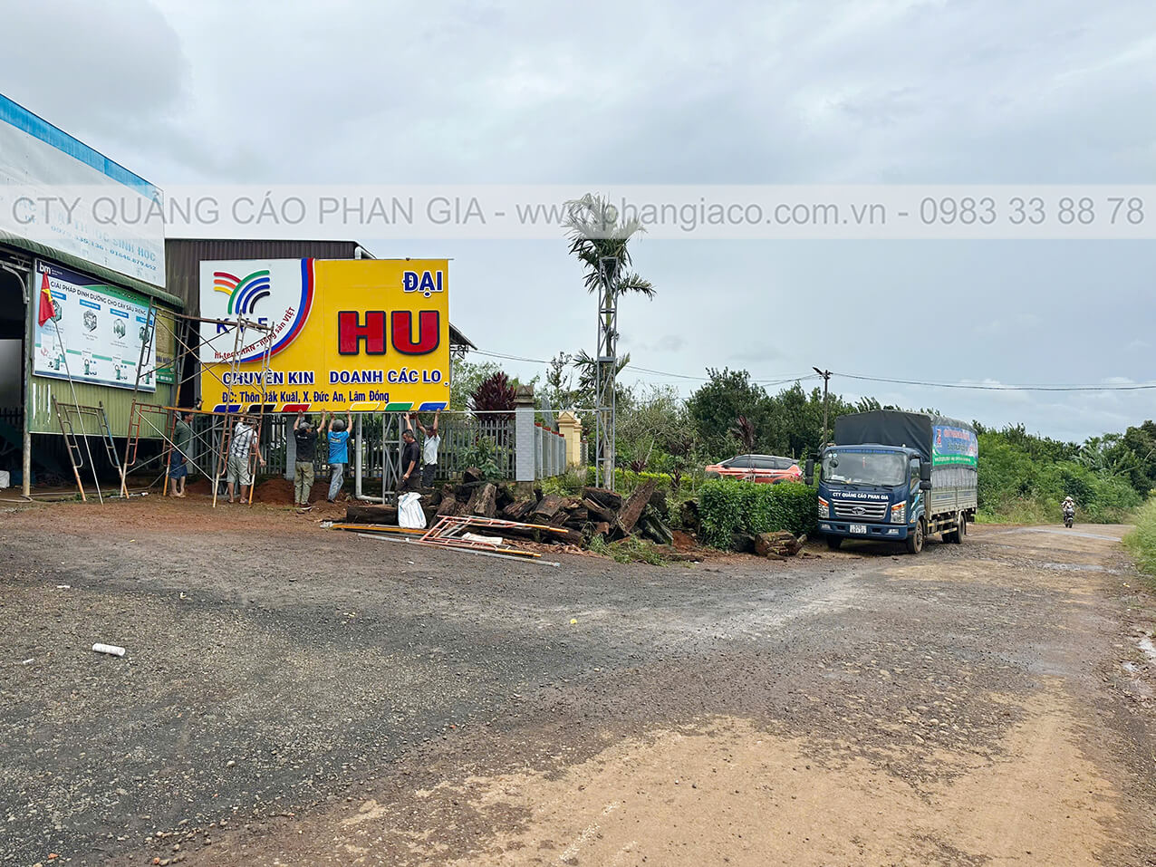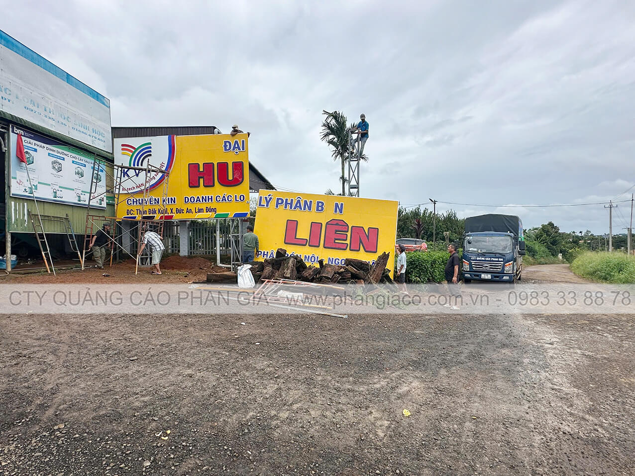 Pano quảng cáo alu chữ mica nổi dựng trụ V40 đại lý phân bón Huệ Liên được Quảng Cáo Phan Gia sản xuất & lắp đặt tại xã Đức An, Lâm Đồng (huyện Đắk Song, Đắk Nông cũ). Một số hình ảnh bảng quảng cáo alu đại lý được thợ thi công PG thực hiện và quy trình lắp đặt pano alu phân bón năm 2026.