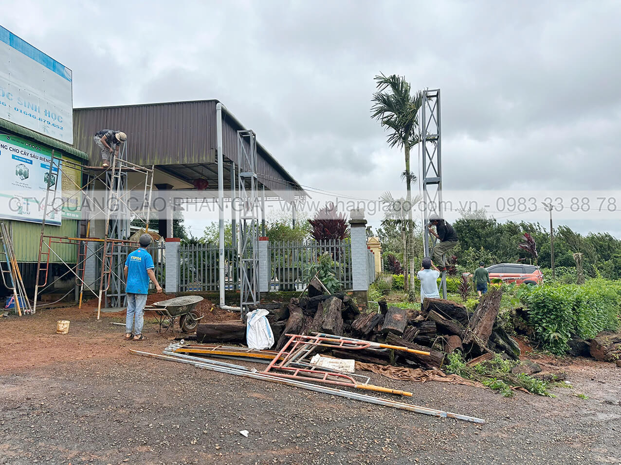 Hình ảnh anh em thợ thi công Phan Gia đang hoàn thiện dựng trụ V40 tại đại lý phân bón