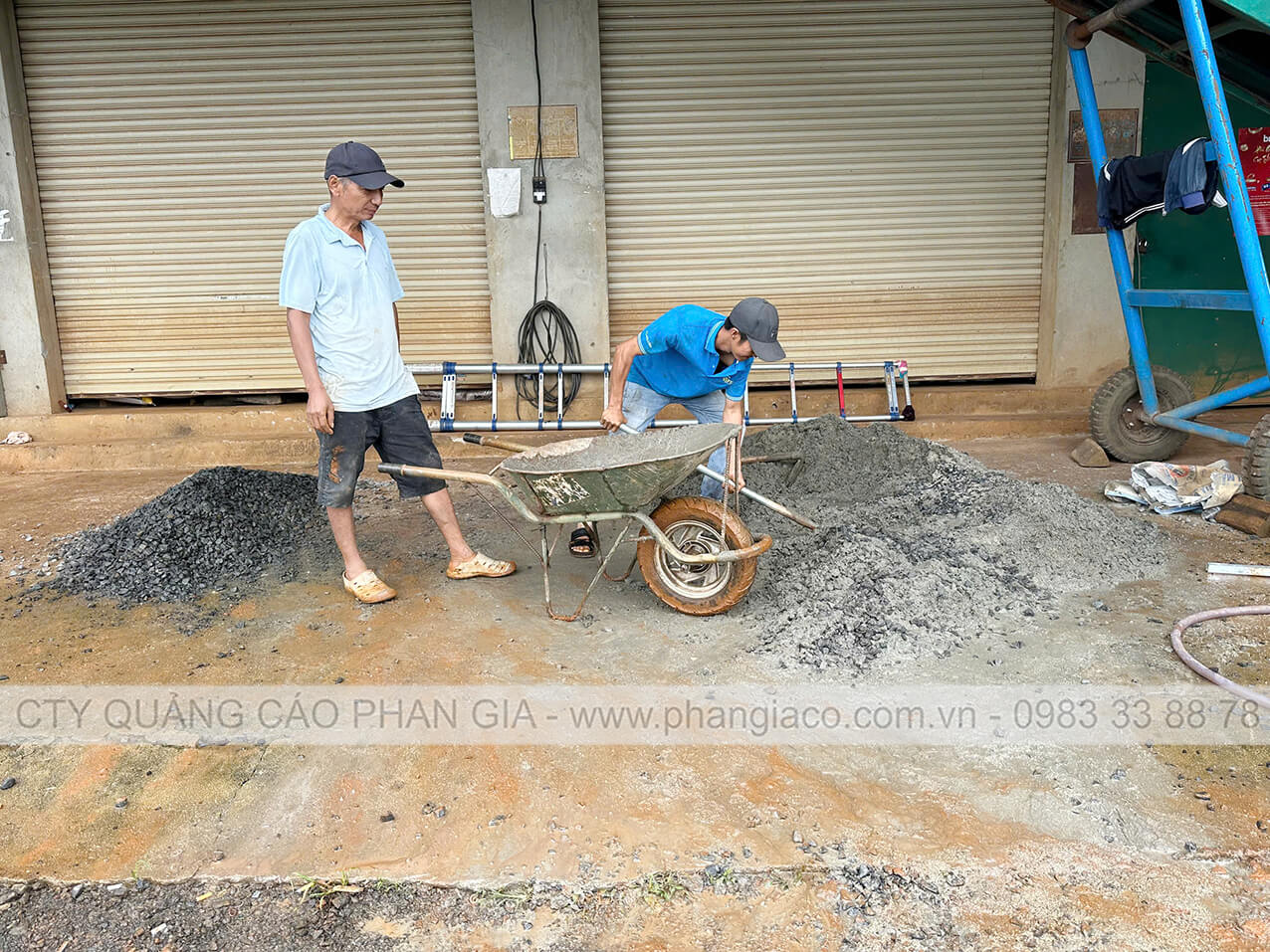 Công đoạn này chia thành 02 nhóm: nhóm trộn bê tông đổ trụ, nhóm canh chỉnh trụ, hàn pass liên kết một cách chắc chắn trước khi đưa bảng alu lên trụ