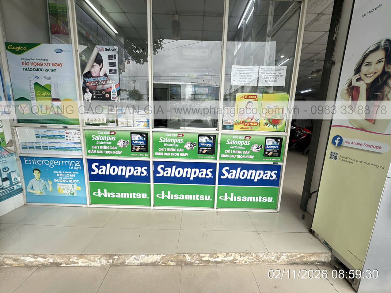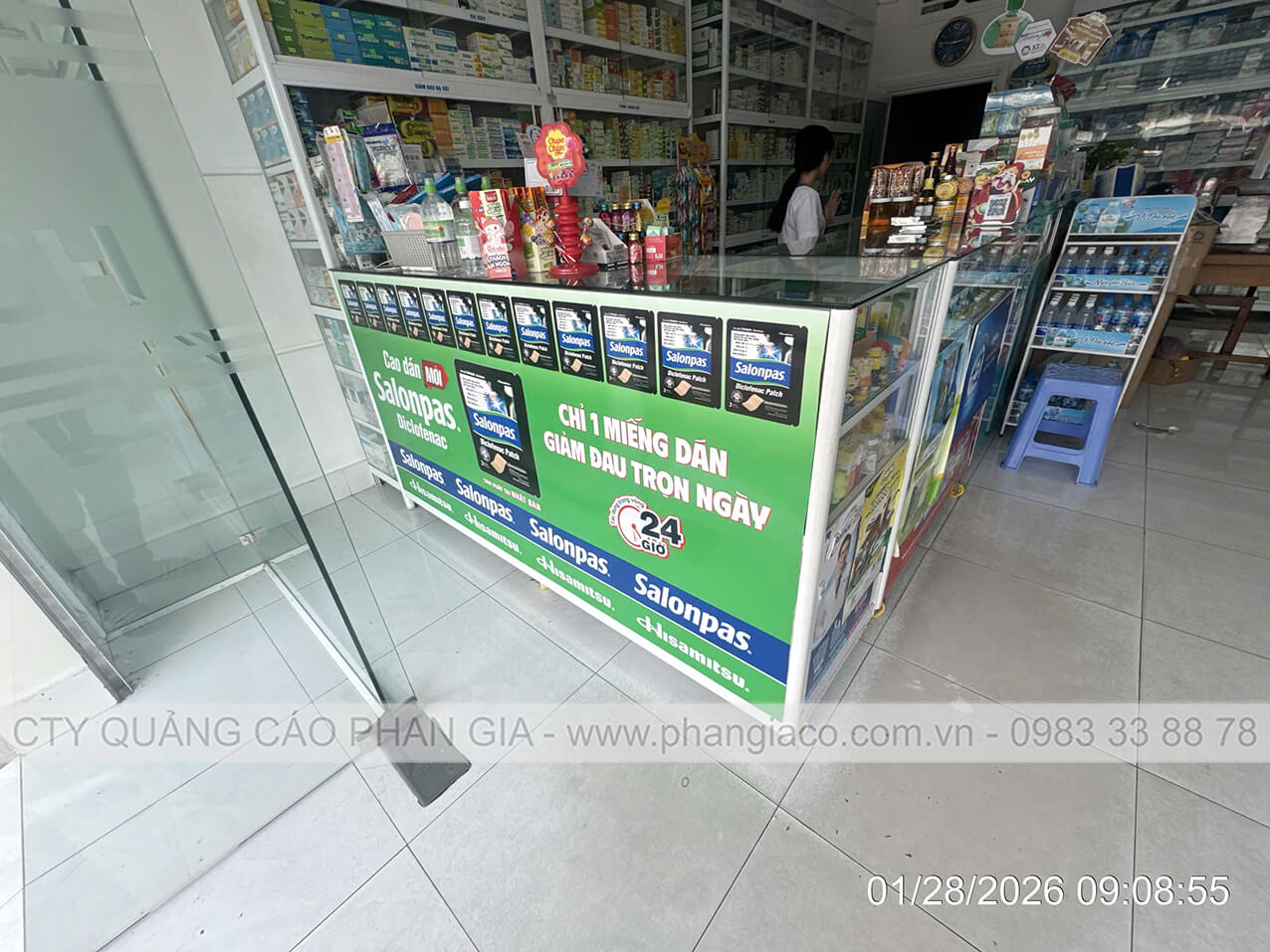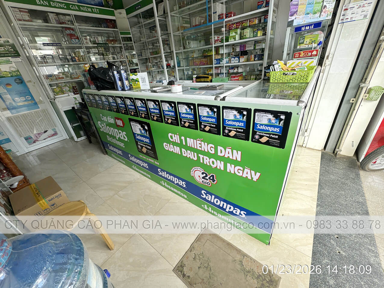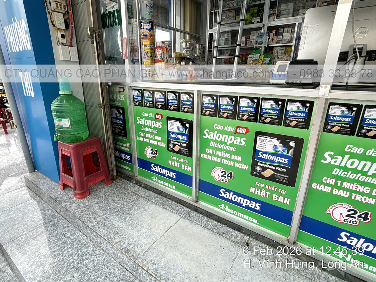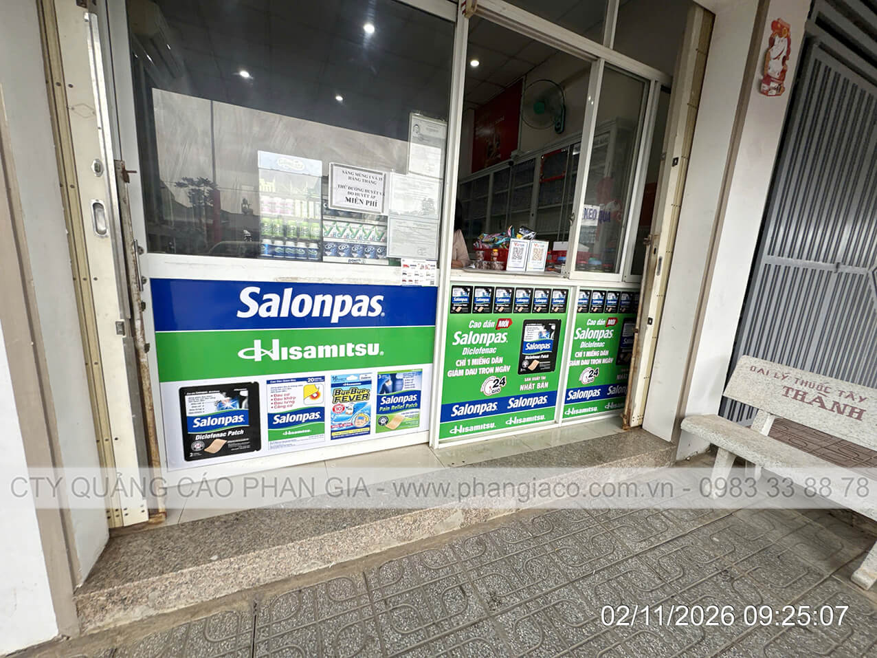 Quảng Cáo Phan Gia, nhà cung cấp in ấn và thi công dán decal quảng cáo tủ thuốc tây uy tín - chuyên nghiệp cho các công ty dược phẩm, hãng dược phẩm có nhu cầu dán quảng cáo sản logo thương hiệu sản phẩm tại chuỗi hệ thống nhà thuốc tây, quầy thuốc tây, hiệu thuốc tây. Một số hình ảnh thi công thực tế Phan Gia đã và đang là nhà cung cấp uy tín lâu năm cho hãng dược phẩm đến từ Nhật Bản - Salonpas Hitsamitsu.