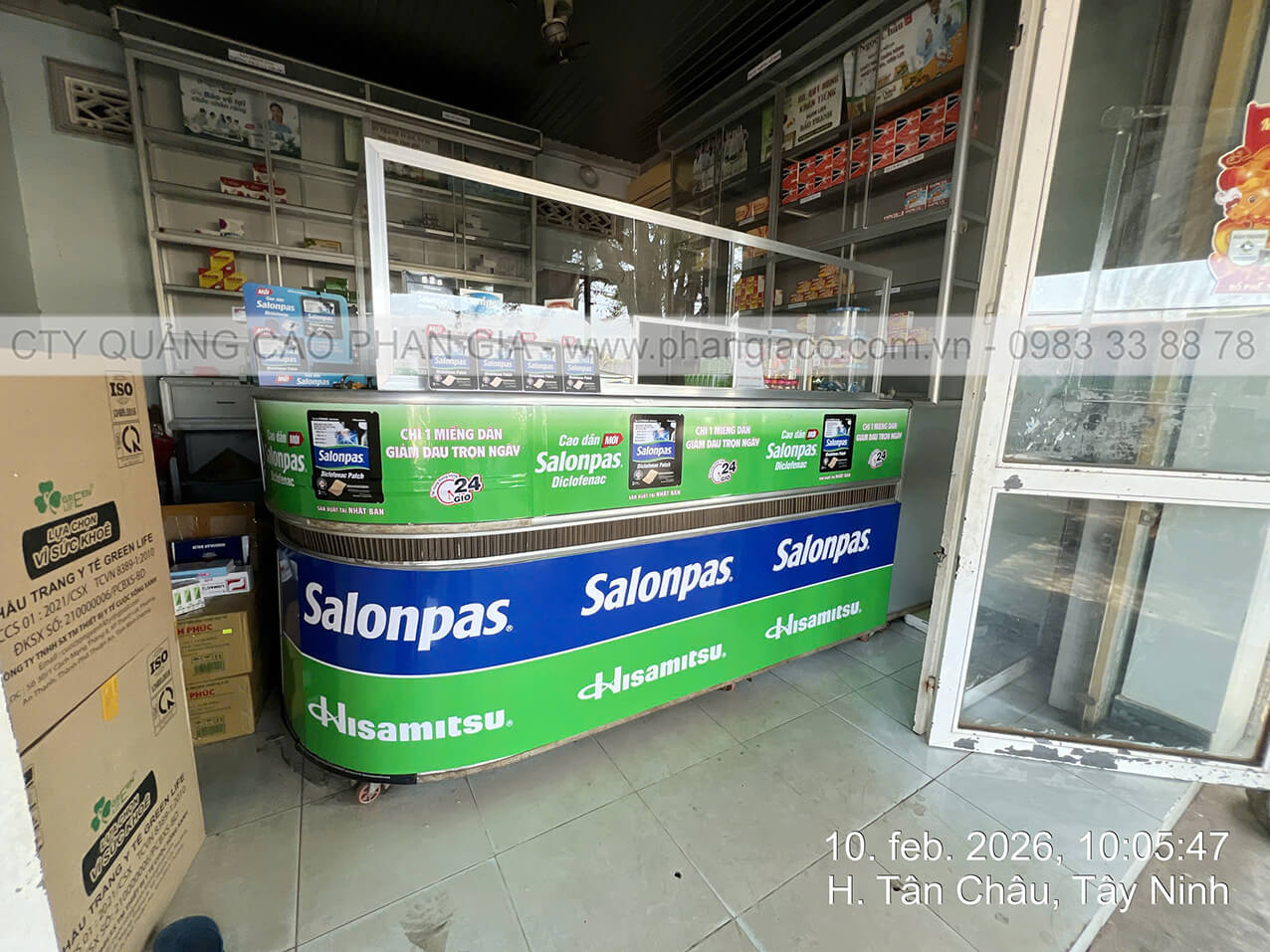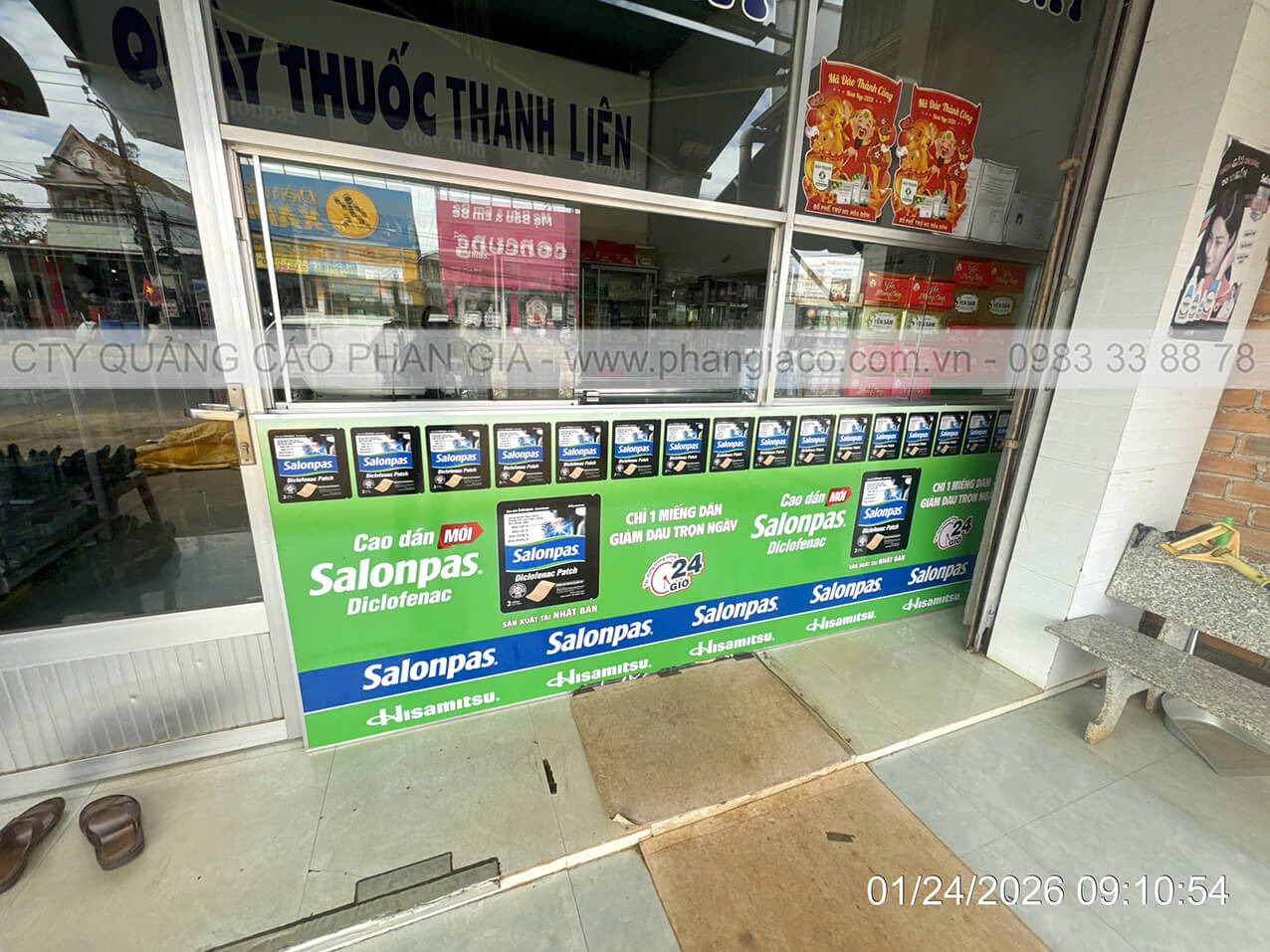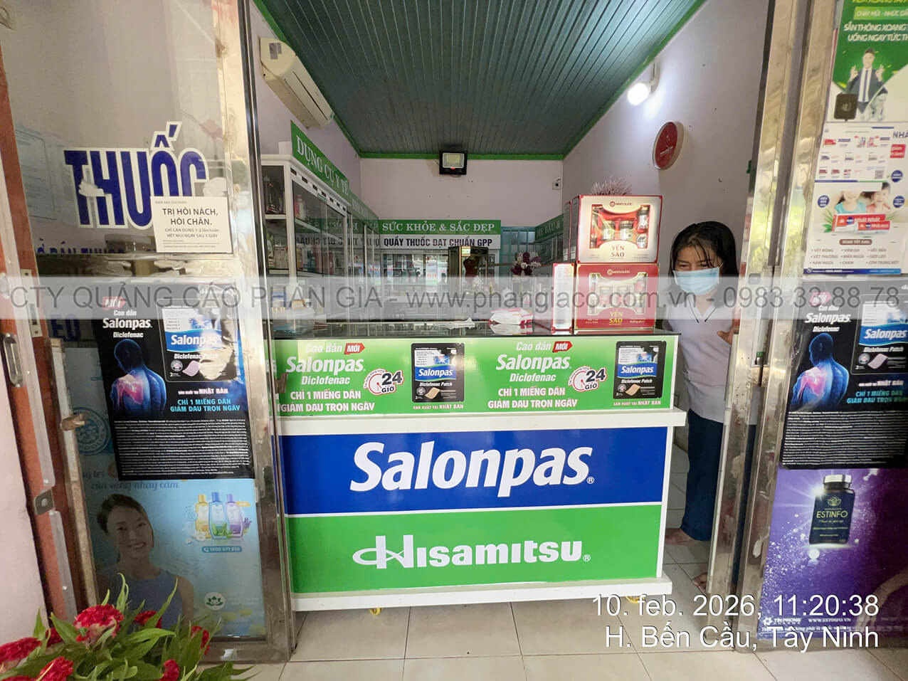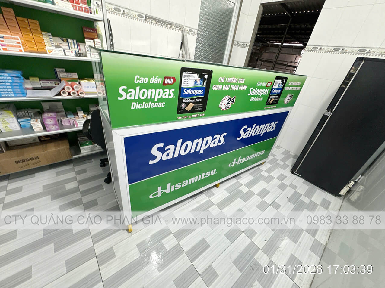 Quảng Cáo Phan Gia, nhà cung cấp in ấn và thi công dán decal quảng cáo tủ thuốc tây uy tín - chuyên nghiệp cho các công ty dược phẩm, hãng dược phẩm có nhu cầu dán quảng cáo sản logo thương hiệu sản phẩm tại chuỗi hệ thống nhà thuốc tây, quầy thuốc tây, hiệu thuốc tây. Một số hình ảnh thi công thực tế Phan Gia đã và đang là nhà cung cấp uy tín lâu năm cho hãng dược phẩm đến từ Nhật Bản - Salonpas Hitsamitsu.
