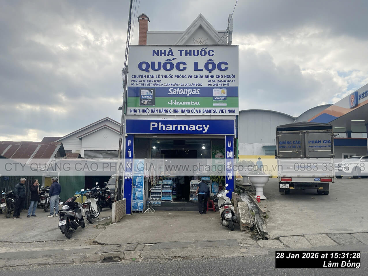 Hình ảnh thực tế bảng hiệu nhôm chữ mica nhà thuốc được anh em thợ thi công Phan Gia lắp đặt tại P. Xuân Hương - Đà Lạt, Lâm Đồng