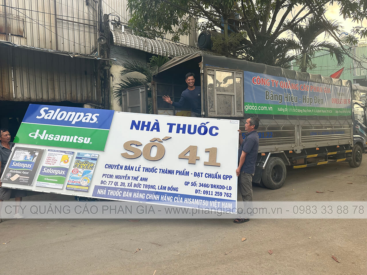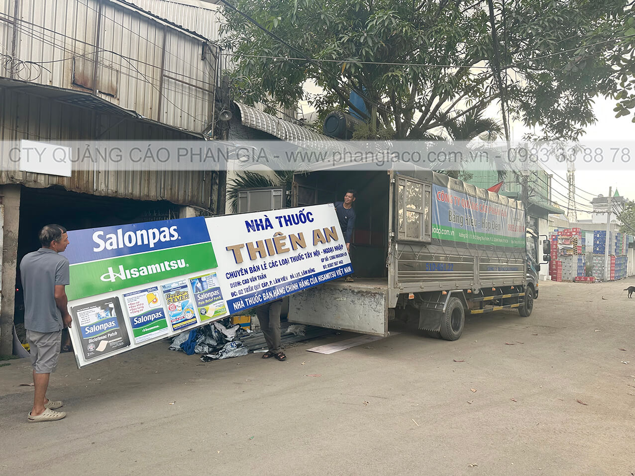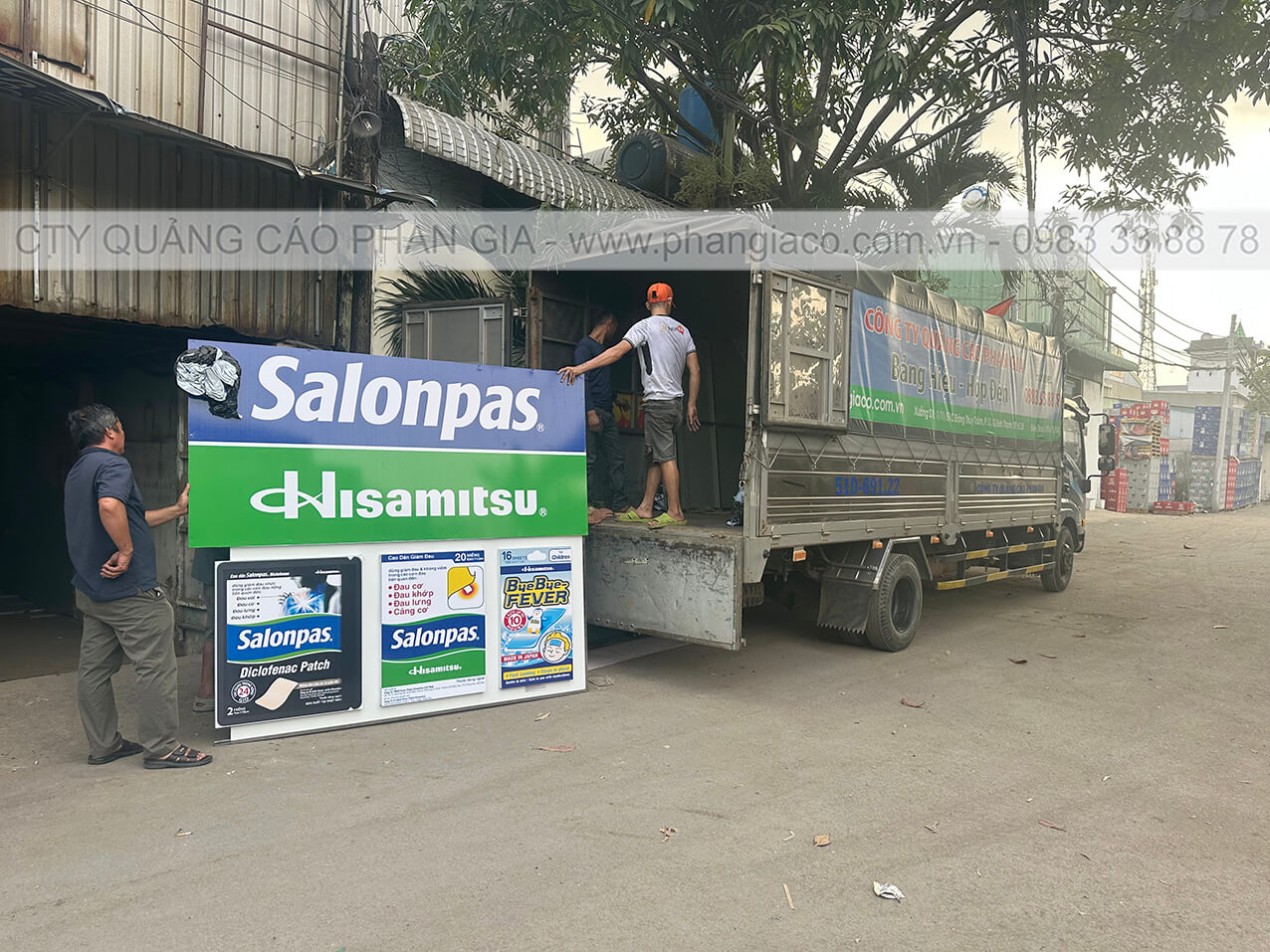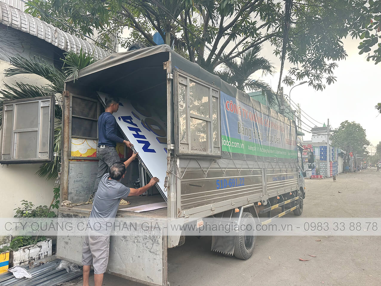 Hình ảnh anh em thợ sản xuất Phan Gia đang xếp bảng quảng cáo alu lên xe tại xưởng Phan Gia