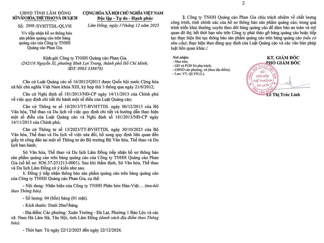 Thông báo quảng cáo (giấy phép quảng cáo) đến Sở VHTT&DL tỉnh Lâm Đồng trước khi lắp đặt bảng hiệu alu