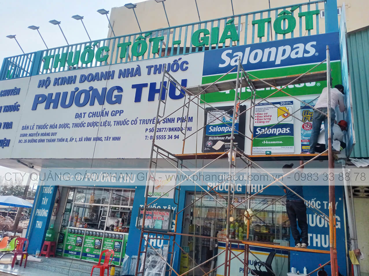 Mặt dựng aluminium chữ nổi mica nhà thuốc được anh em thợ thi công Phan Gia hoàn thiện và bàn giao cho khách hàng đưa vào sử dụng tại Vĩnh Hưng, Long An