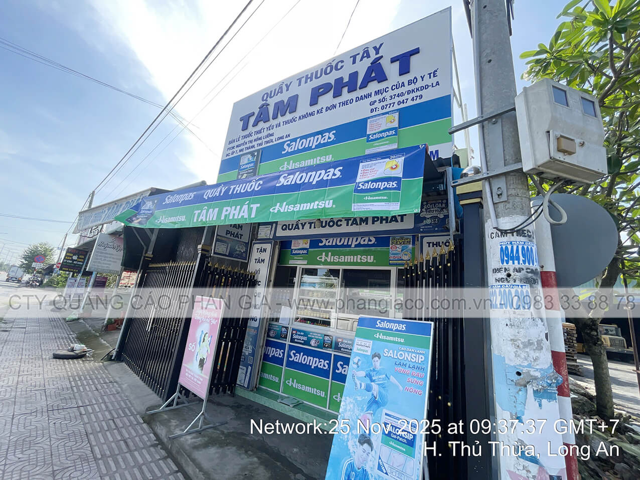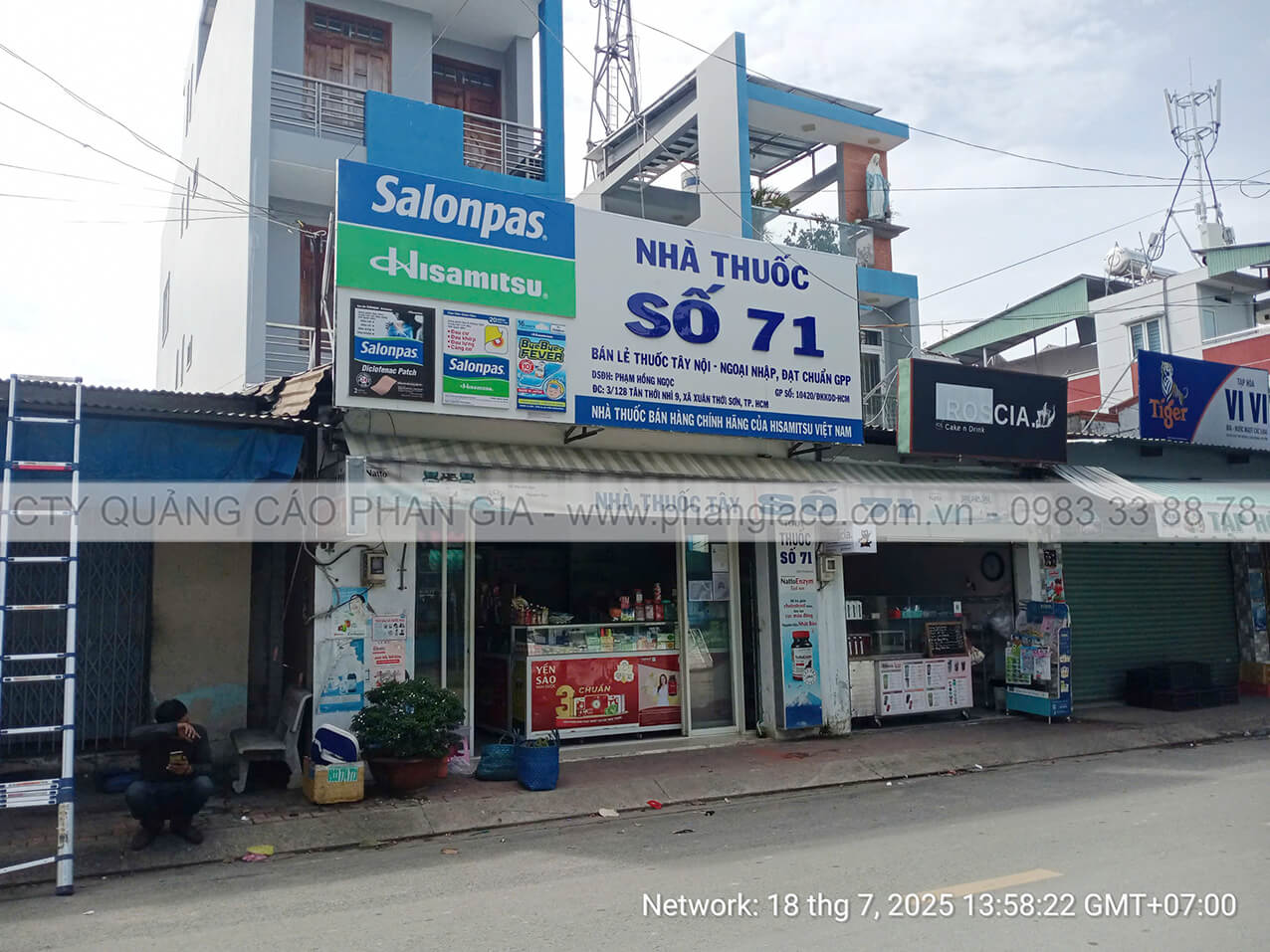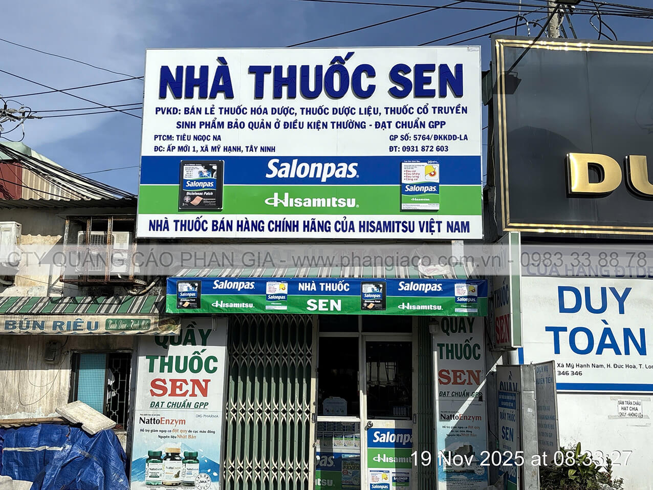 Bảng hiệu alu chữ nổi mica nhà thuốc tây Phan Gia khảo sát, thiết kế, sản xuất, vận chuyển và lắp đặt tại xã Mỹ Hạnh, Tây Ninh (huyện Đức Hòa, Long An cũ)