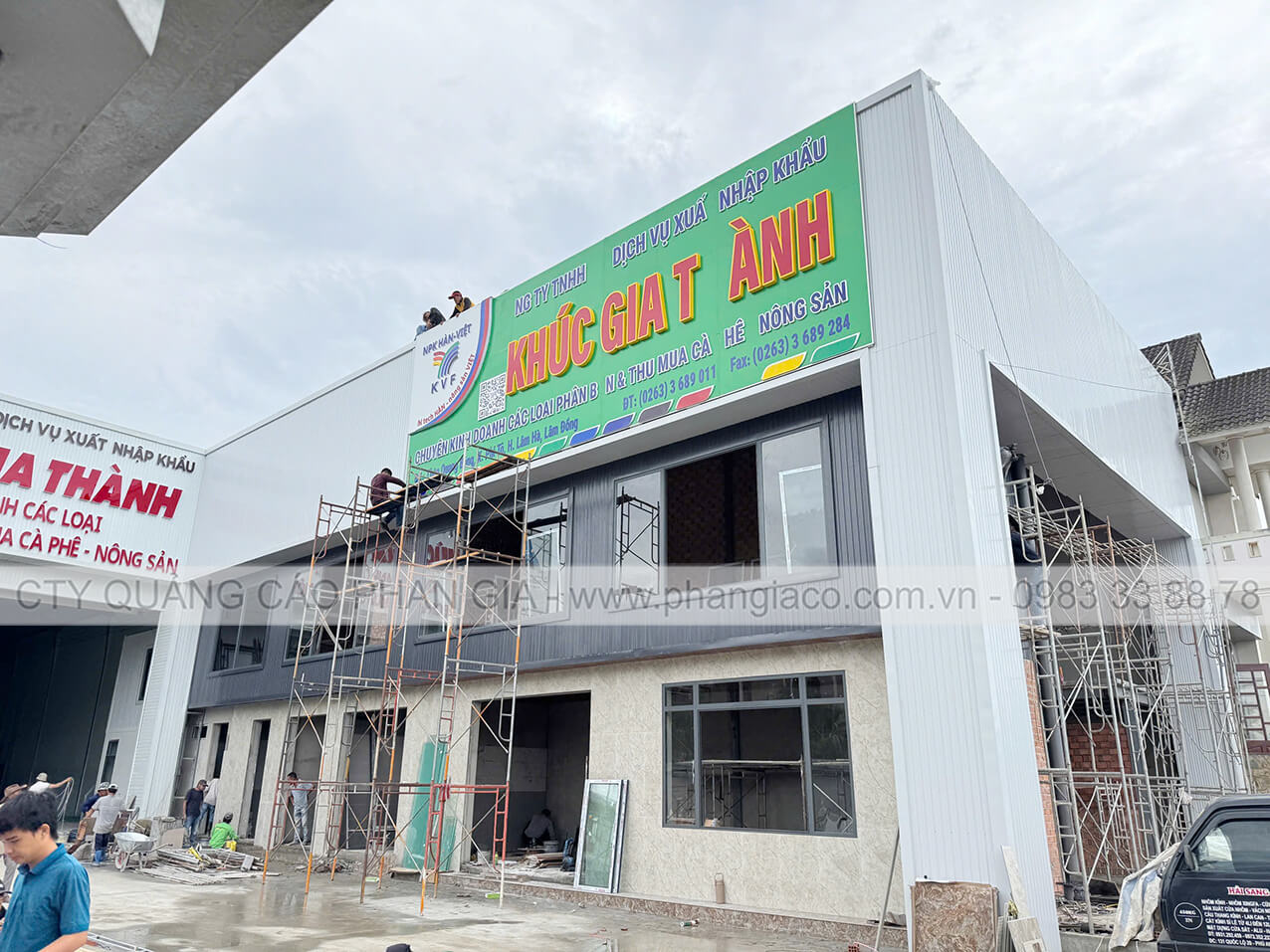 Hình ảnh anh em thợ PG lắp đặt tại công trình bảng hiệu alu nhà phân phối phân bón có kích thước lớn